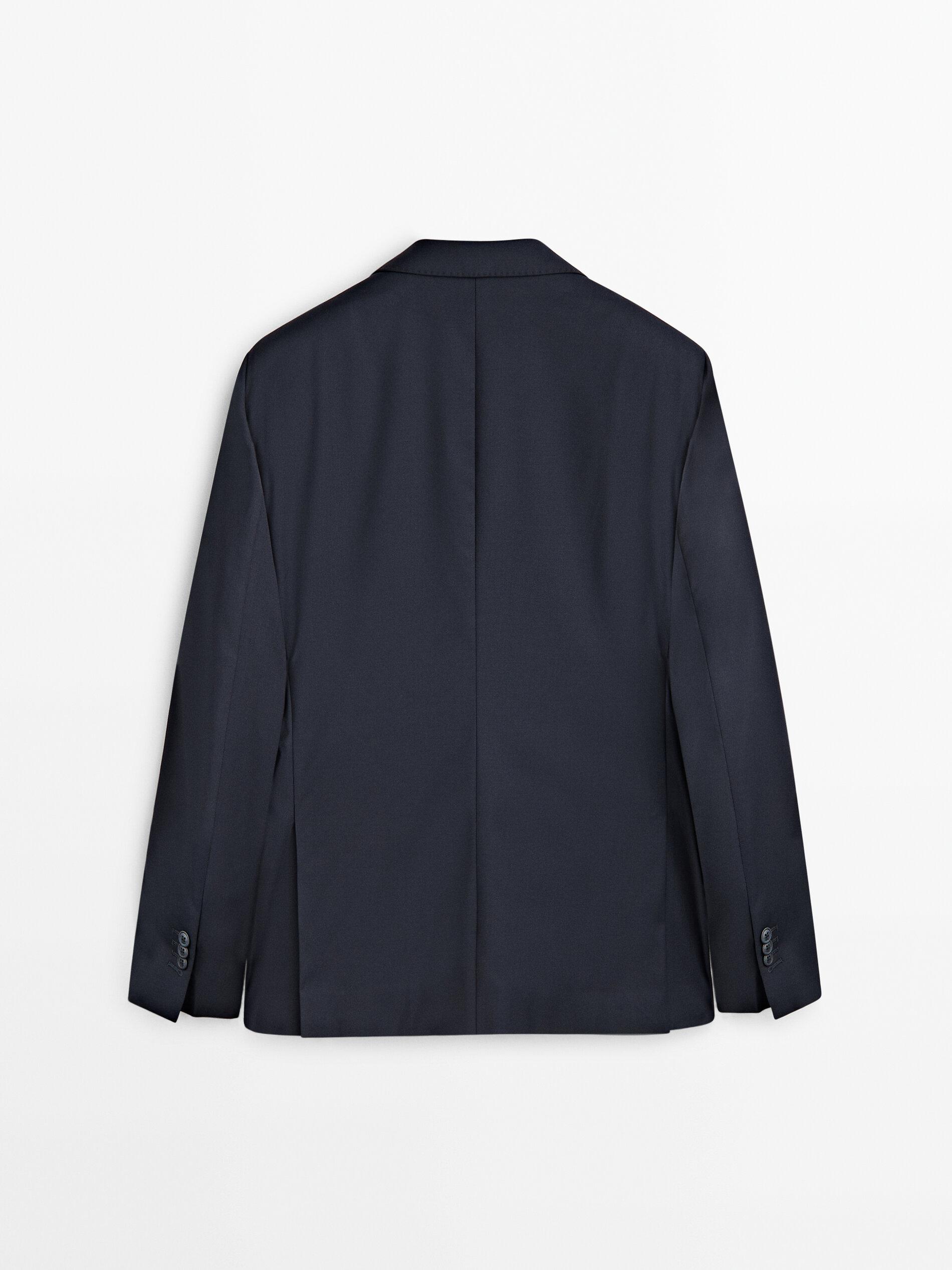Blazer en mélange de laine. Tissu d’origine italienne. Poignet à quatre boutons. Fermeture à deux boutons. Col à revers en pique et boutonnière. Deux poches à rabat. Une poche poitrine insérée. Fentes latérales au niveau de l’ourlet. Doublure intérieure. Fabriqué au Portugal. Ce vêtement fait partie d’un costume. Ce vêtement est plus large que d’habitude.. Silhouette ample et décontractée, non ajustée près du corps.