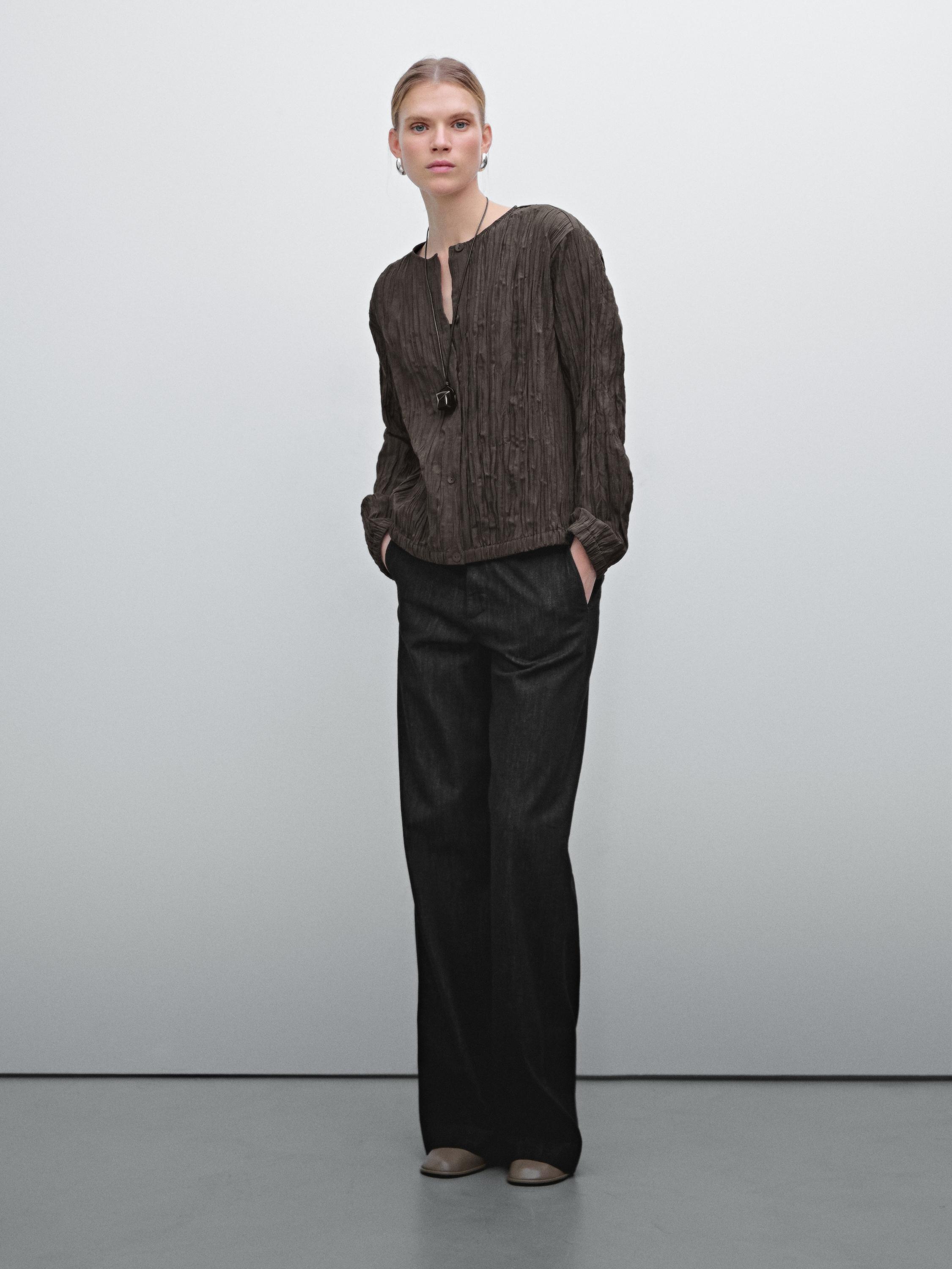 Camisa estilo bomber fluida . Cuello caja. Tejido plisado con acabado efecto arrugado. Cierre mediante botonadura frontal. Detalle de goma elástica en la zona de los puños y el bajo. Silueta amplia y relajada, sin ajuste al cuerpo.