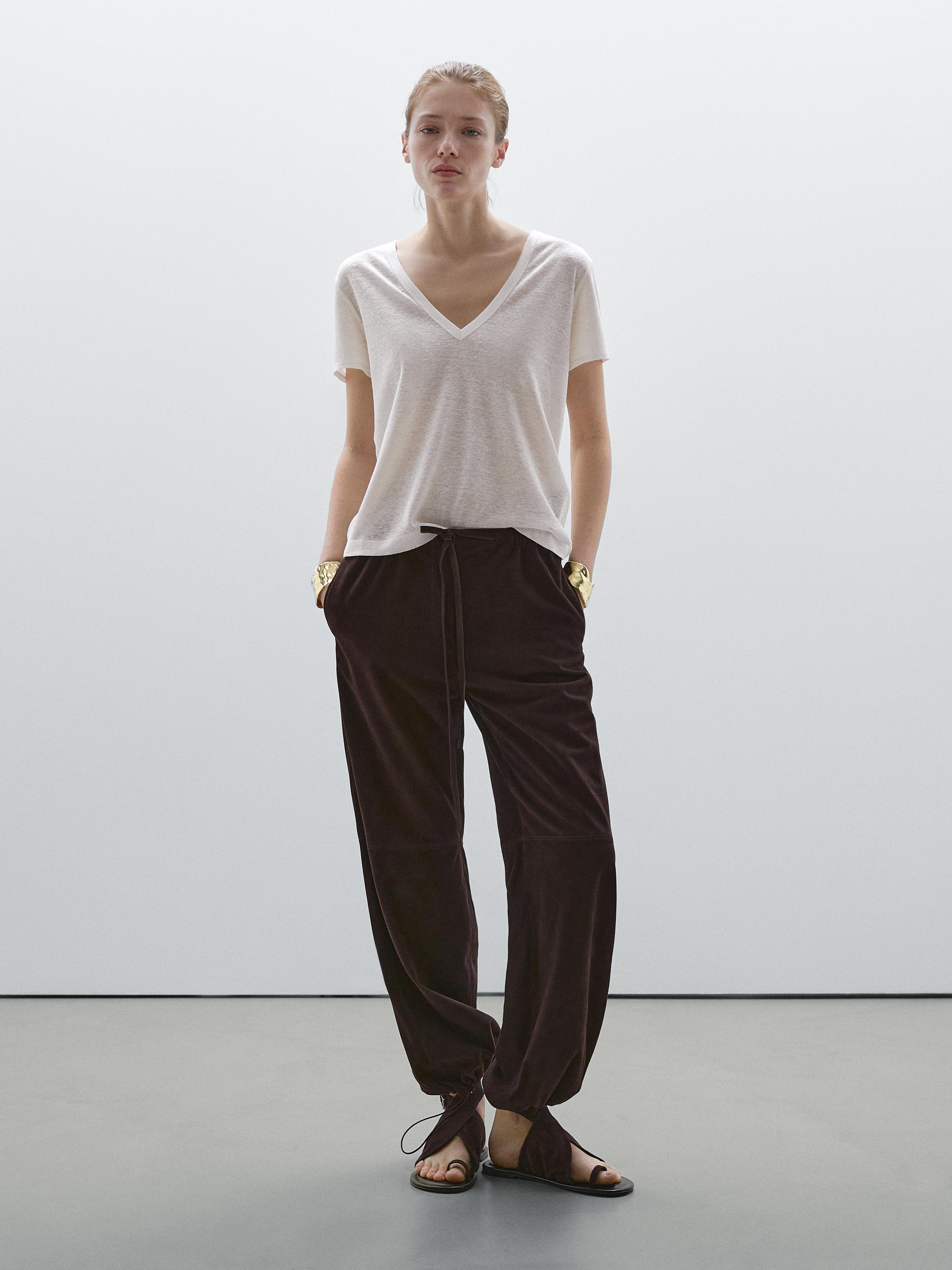 Camiseta confeccionada en tejido 100% lino . Cuello pico. Manga corta. Acabados en rib.