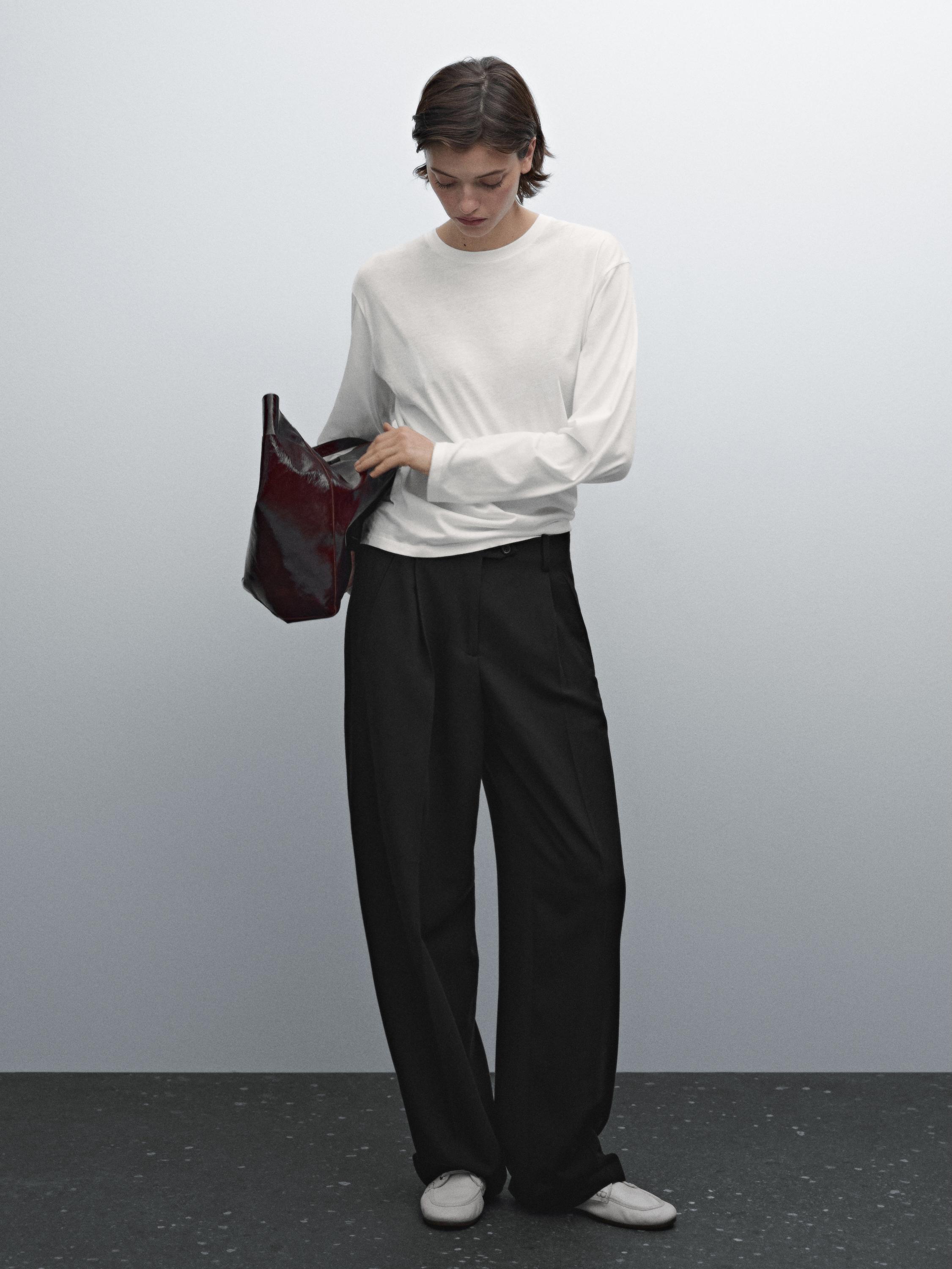 Pantalón Straight fit: presenta una silueta recta desde la cintura hasta el tobillo, sin ajustes adicionales en las piernas. Cintura con trabillas . Cierre mediante cremallera oculta por tapeta, corchete y tira abotonada. Dos bolsillos de ojal en la parte posterior. Detalle de pinzas en la parte frontal.