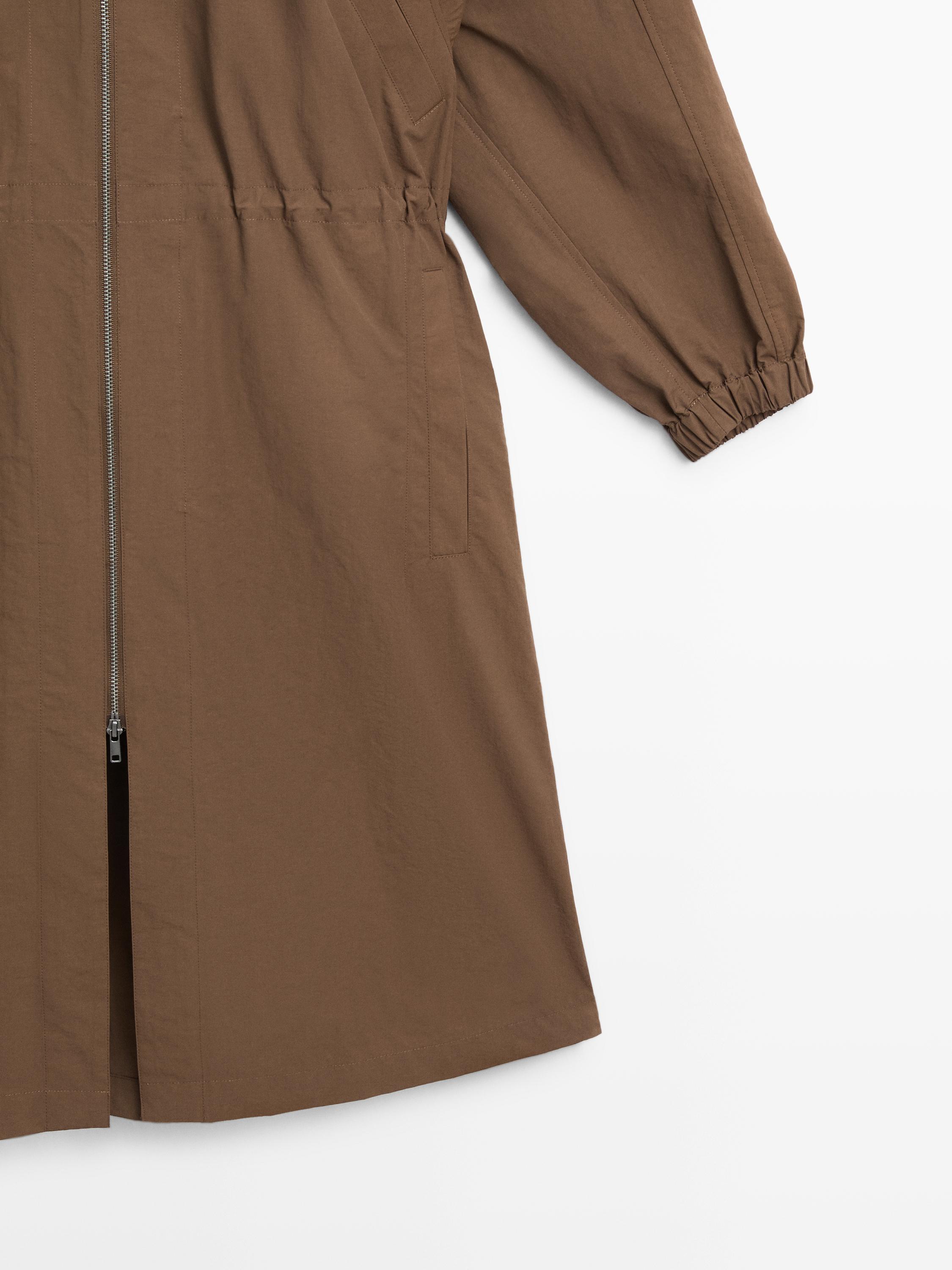 Tehnilisest kangast pikk parka . Pikad varrukad, kummiga mansetid. Lukuga kinnis. Kapuutsiga kõrge kaelus. Vöökohal on peenike pael. Kaks küljetaskut.