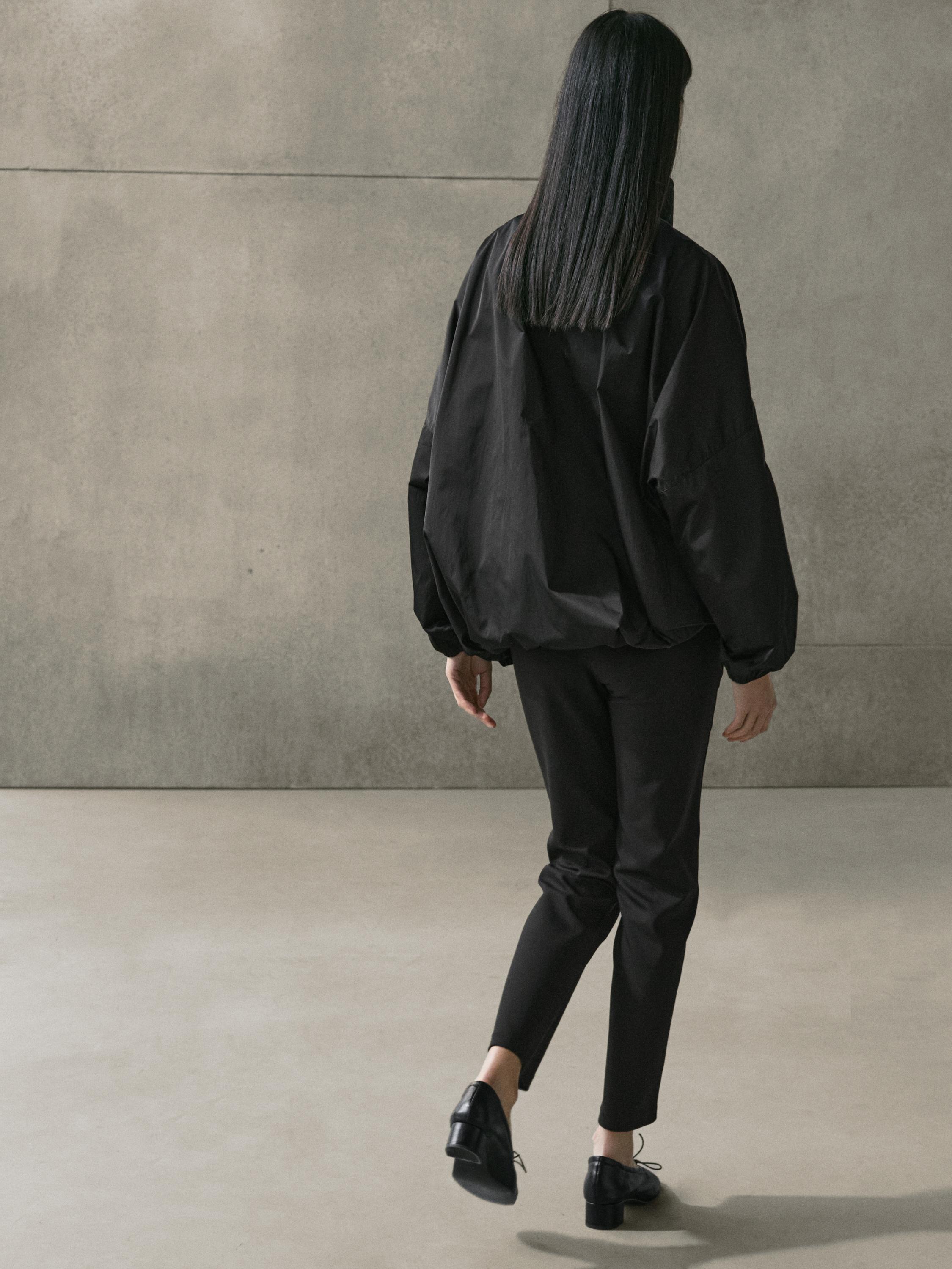 Куртка-бомбер. Длинные рукава с эластичными манжетами. Легкая высокотехнологичная ткань. Высокий воротник с пуговицами. Adjustable elastic waistband. Потайная молния под планкой с пуговицами. Два накладных кармана с клапаном.