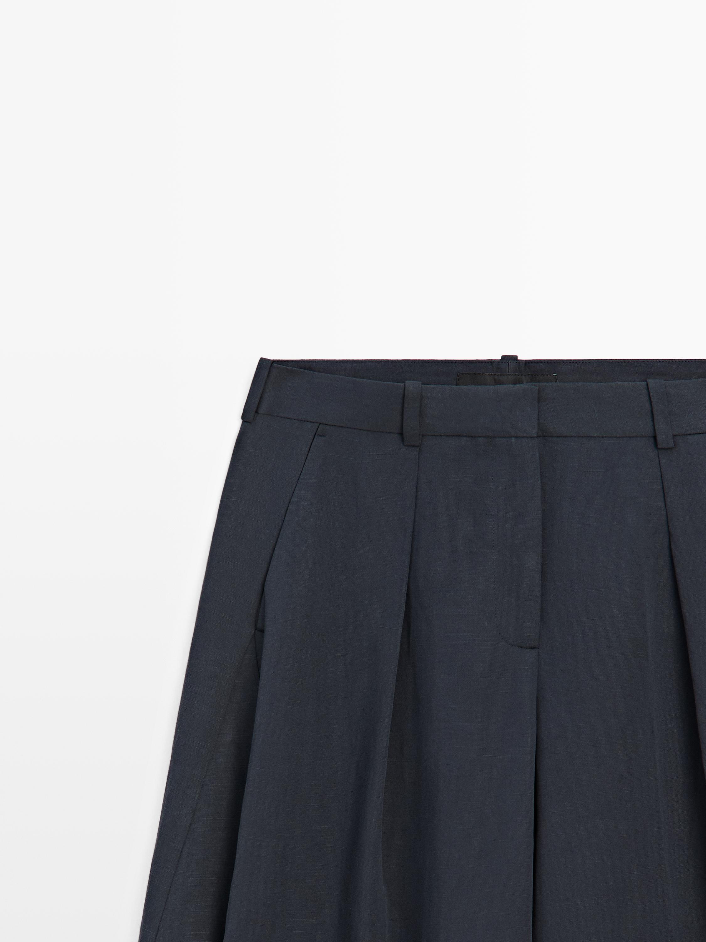 Vabalt langevast kangast püksid. Vööaasadega värvel . Kaetud luku ja sisekülje nööbiga kinnis . Kaks küljetaskut.