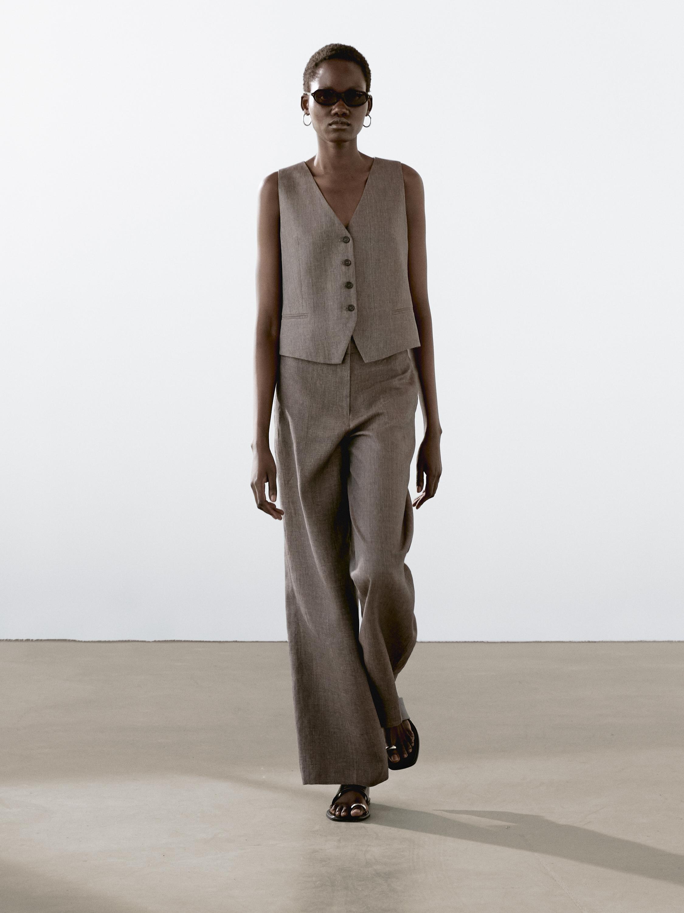 جاكيت فيست مصنوع 100% من قماش الكتان . فتحة صدر على شكل V . جيبين منسدلين. مبطن. متاح قطعة بلون مماثل.