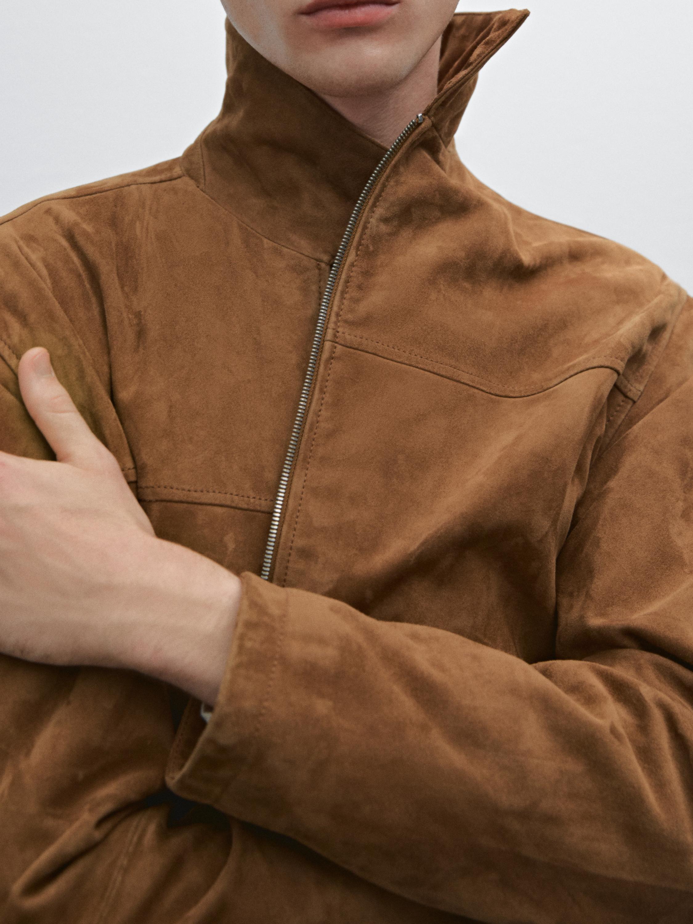 جاكيت مصنوع من جلد الماعز بمظهر شامواه. طوق قميص. إغلاق بسحّاب ثنائي الاتجاه. جيوب على الجانبين. مبطن. تفاصيل بدرزات .