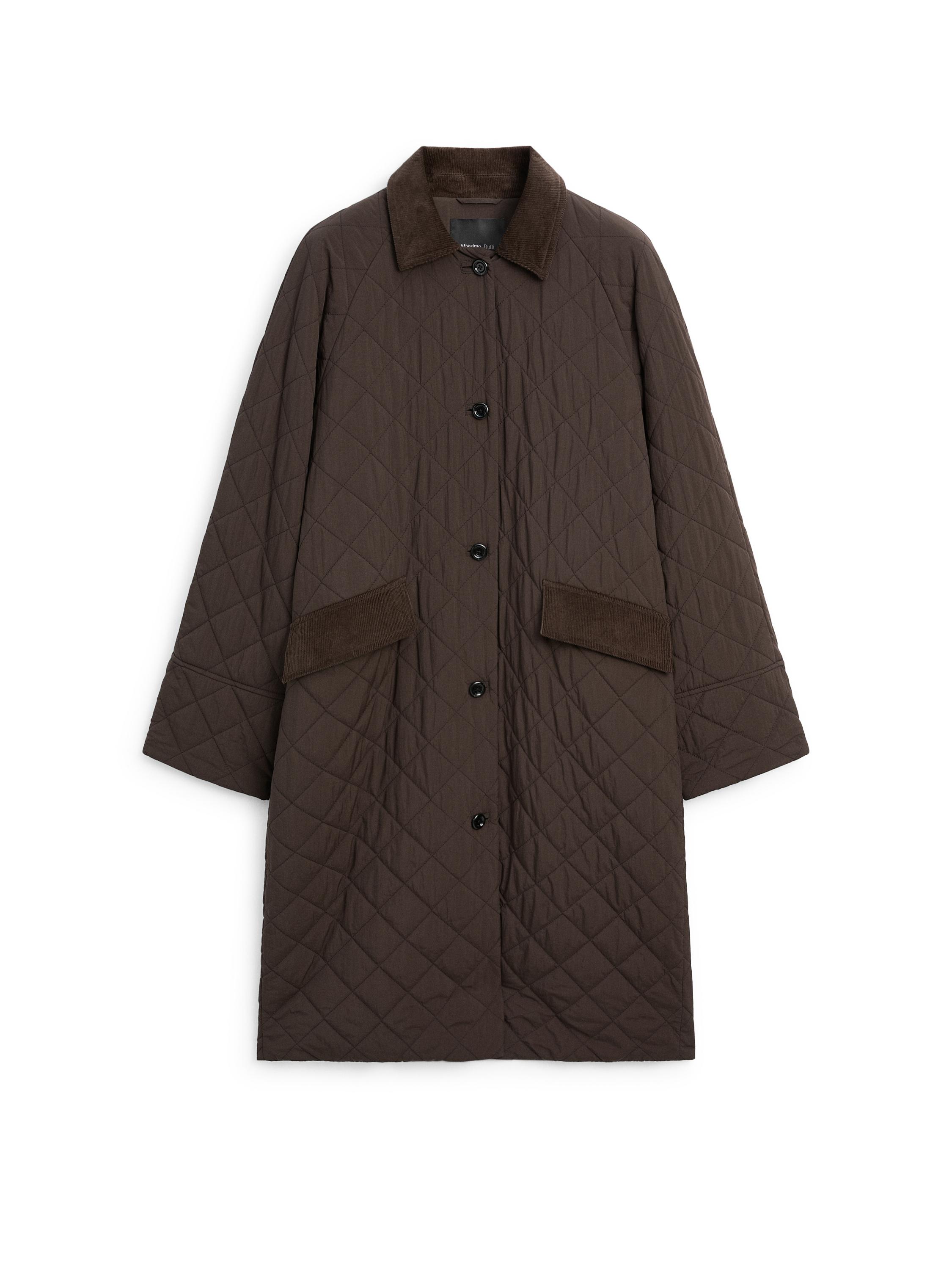 Abrigo largo acolchado. Cuello camisero. Manga ranglán. Detalle de tejido de pana en cuello puños y bolsillos. Cierre mediante botonadura frontal. Capucha extraíble. Dos bolsillos con solapa. Tejido repelente al agua.