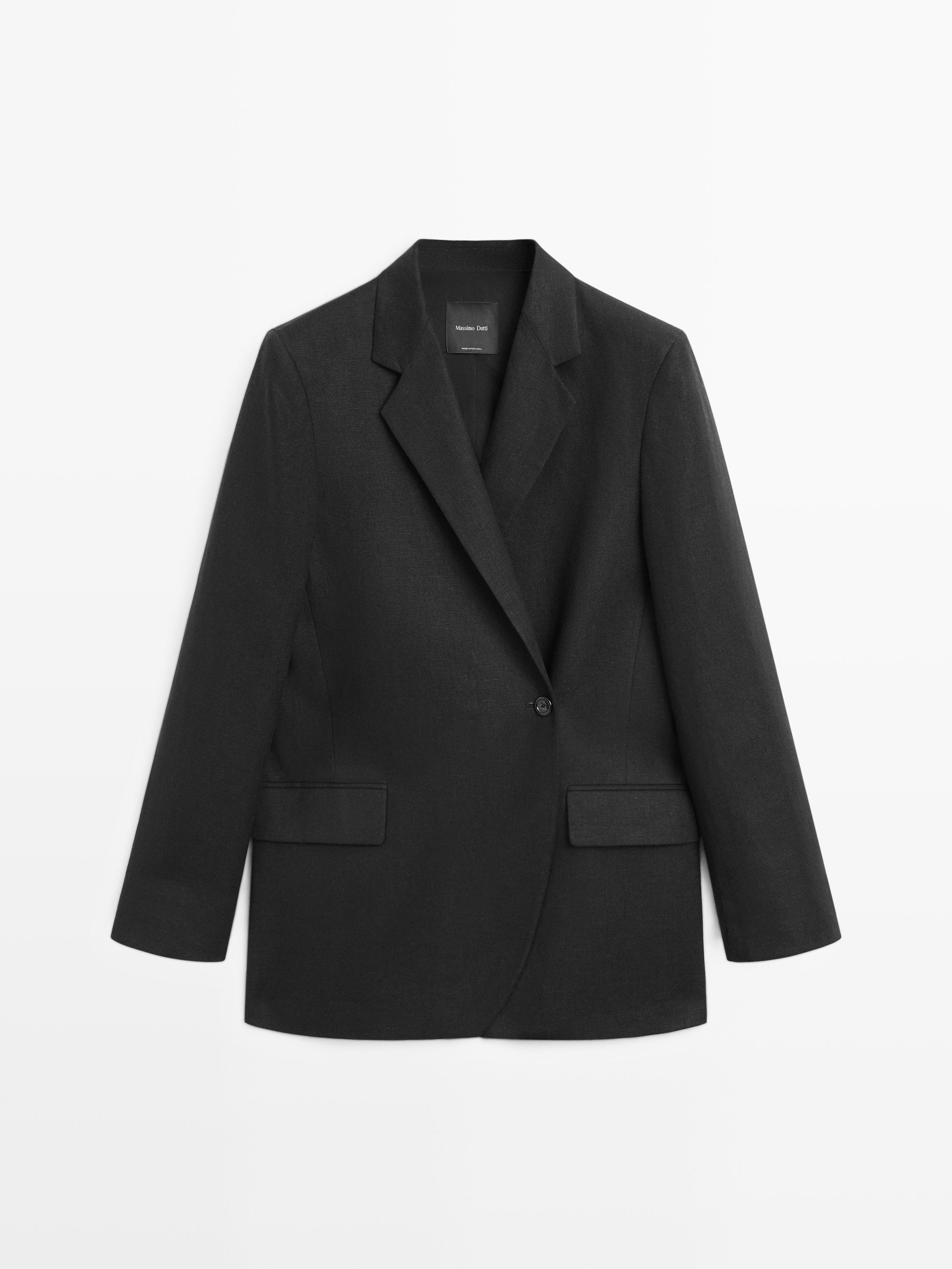 Americana confeccionada en tejido principal 100% lino. Cuello con solapa de muesca. Manga larga. Cierre cruzado mediante un botón y botón oculto . Forro interior.