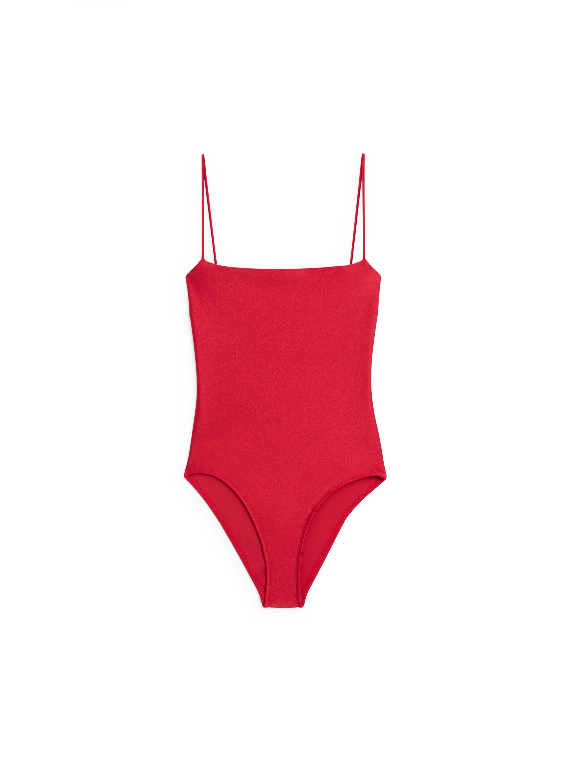 Bañador con escote recto, tirantes finos cruzados con espalda al aire y acabado shiny.