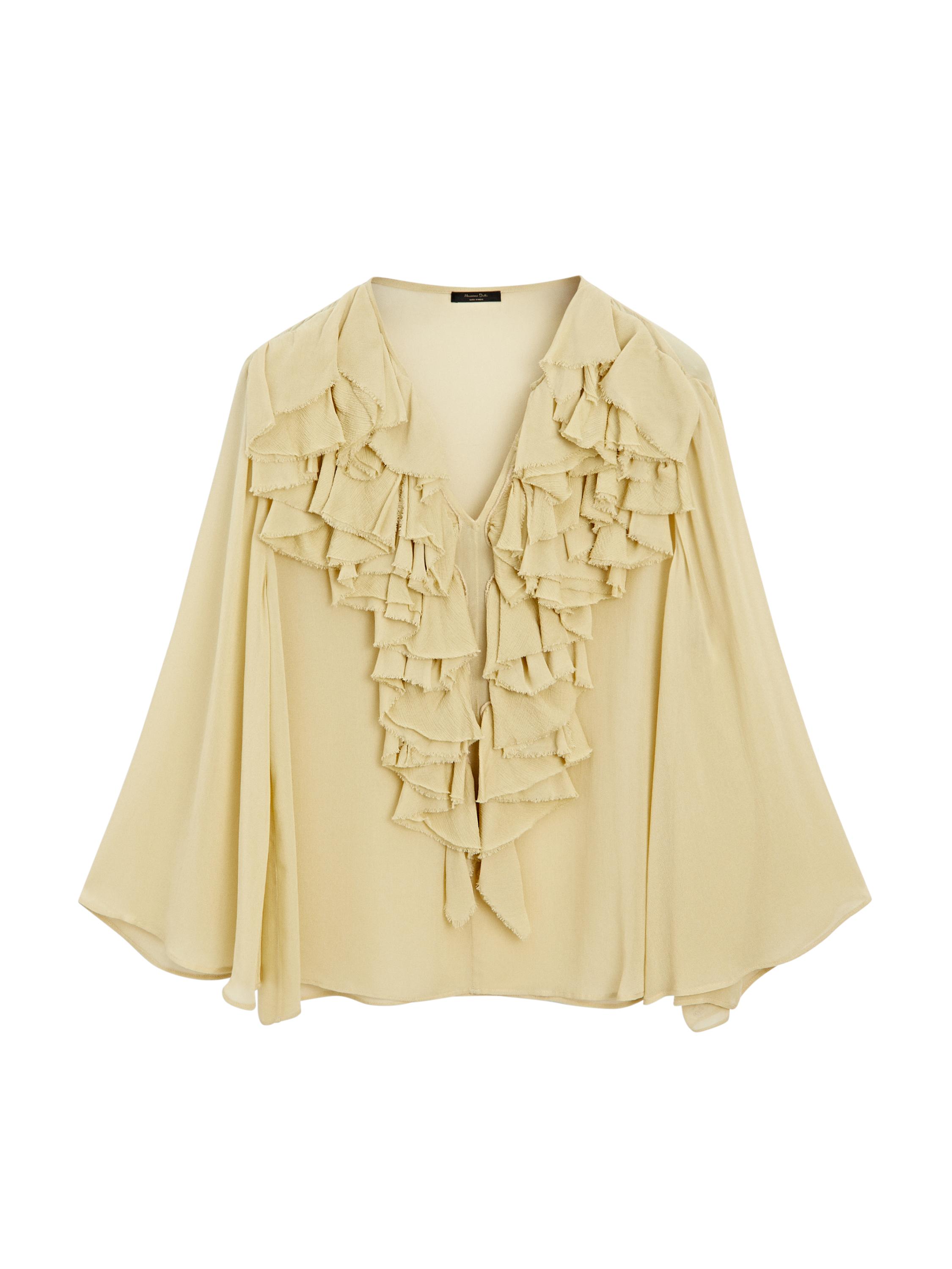 Brusa fluida amb teixit semitransparent. Escot en punta amb volant. Màniga llarga ampla.