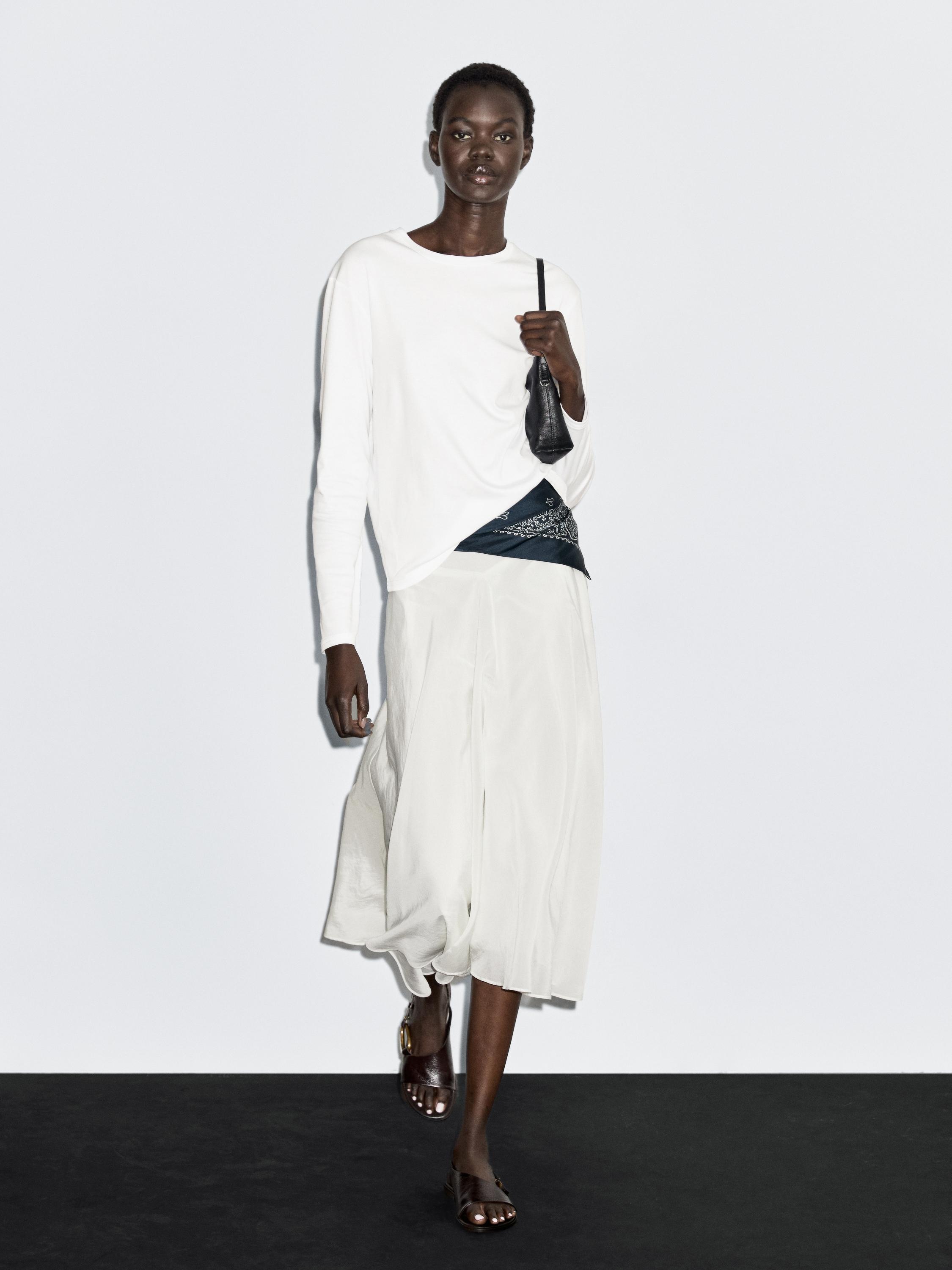 Camiseta confeccionada en tejido 100% algodón, suave, fluida y con un leve brillo. Cuello redondo. Manga larga. Detalle de costura central en la zona posterior. Silueta amplia y relajada, sin ajuste al cuerpo.