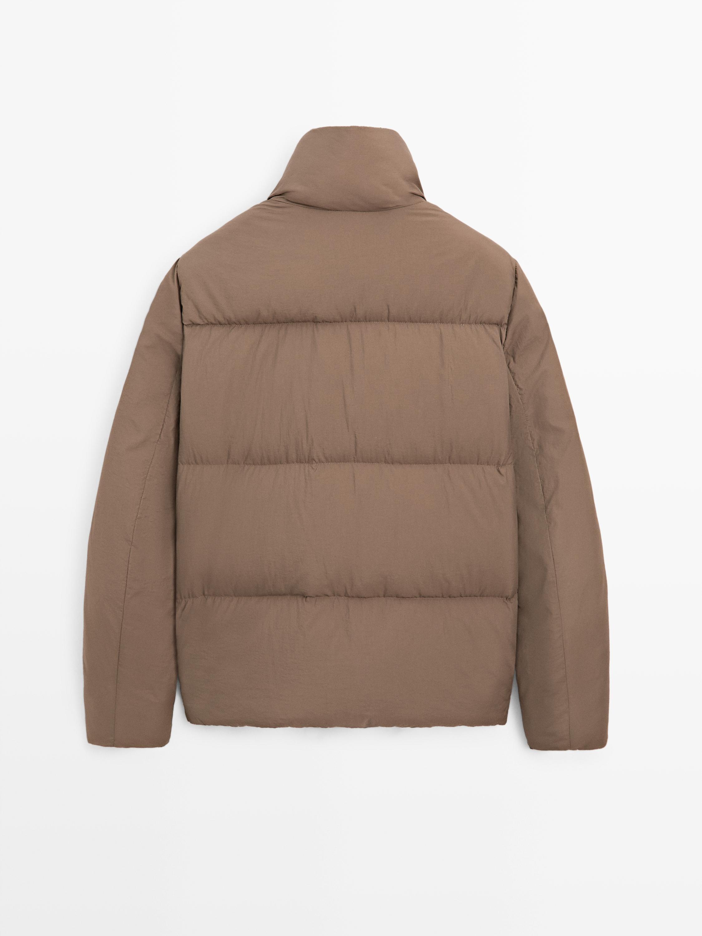 Chaqueta acolchada con relleno interior mezcla de plumón y plumas. Manga larga con puño rib . Cremallera oculta por tapeta y botón snap. Cuenta con una escala interna que indica su nivel de aislamiento térmico según la temperatura. Cuello alto con botonadura tipo snap. Bajo con goma ajustable. Dos bolsillos laterales con cierre cremallera. Detalle de cuello en tejido de punto .