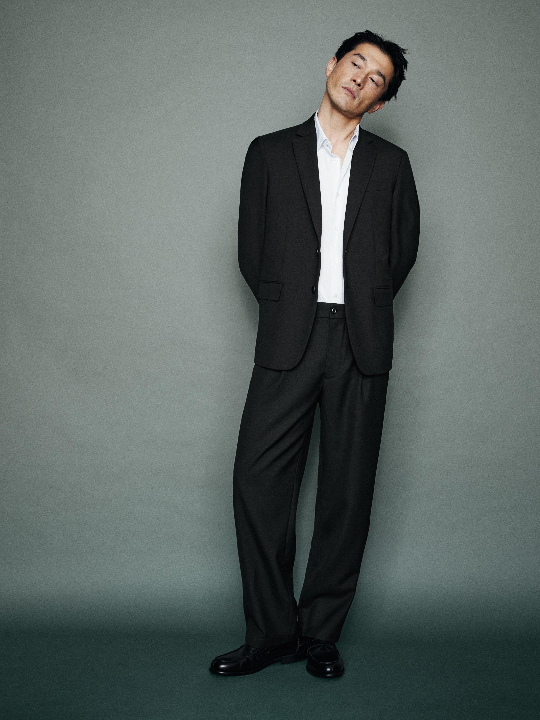 Aurpegitik ikusita, relaxed fit praka beltza, pintza eta albo-poltsikoekin.