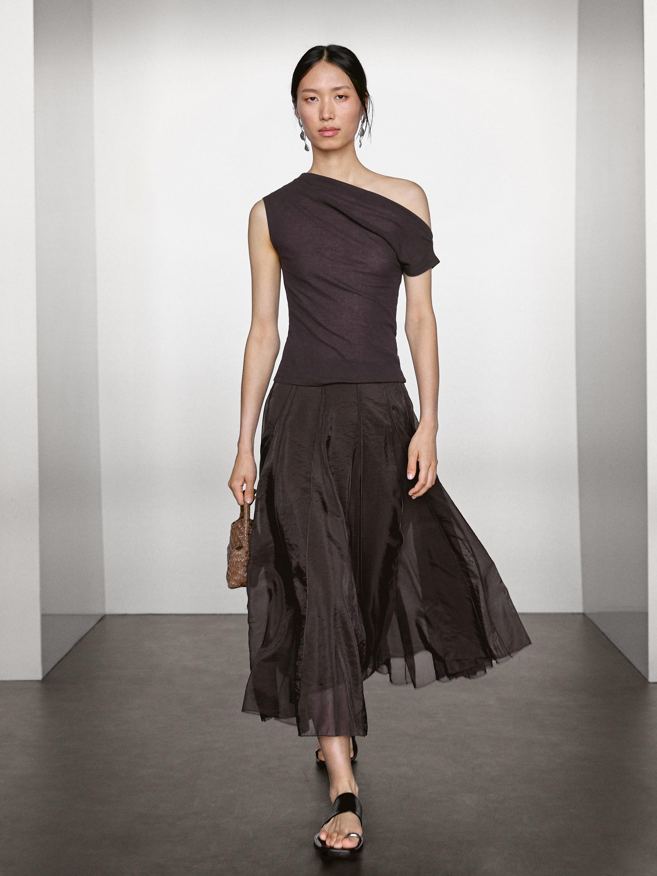 Falda midi godets. Cierre mediante cremallera lateral. Forro interior. Tejido fluido.