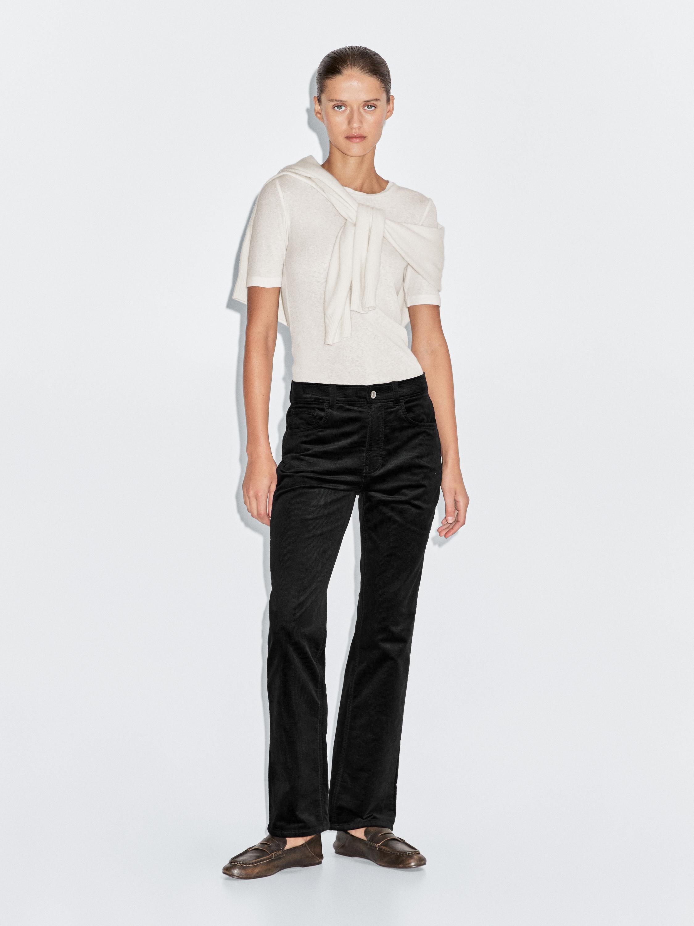 Pantalón confeccionado en tecido con mestura de algodón. Peche frontal con cremalleira e botón. Deseño de cinco petos. Tecido de micro pana. Ten un fit recto relaxado.