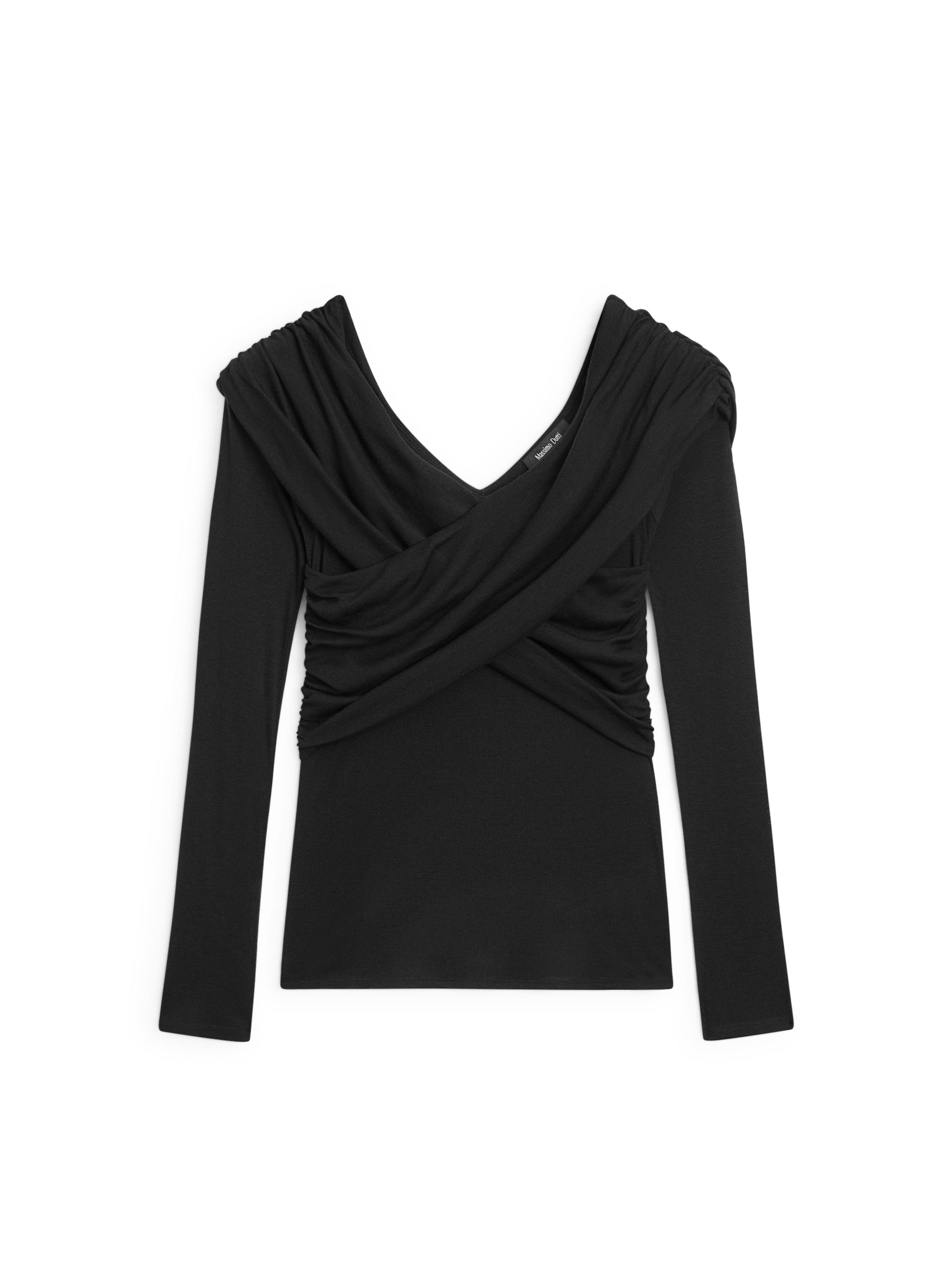 Top confeccionado en tecido con mestura de lyocell. Silueta lixeiramente axustada ao corpo, que proporciona un aspecto máis definido e estilizado. Manga longa. Ombros descubertos. Detalle de engurras. Tecido suave e agradable ao tacto .