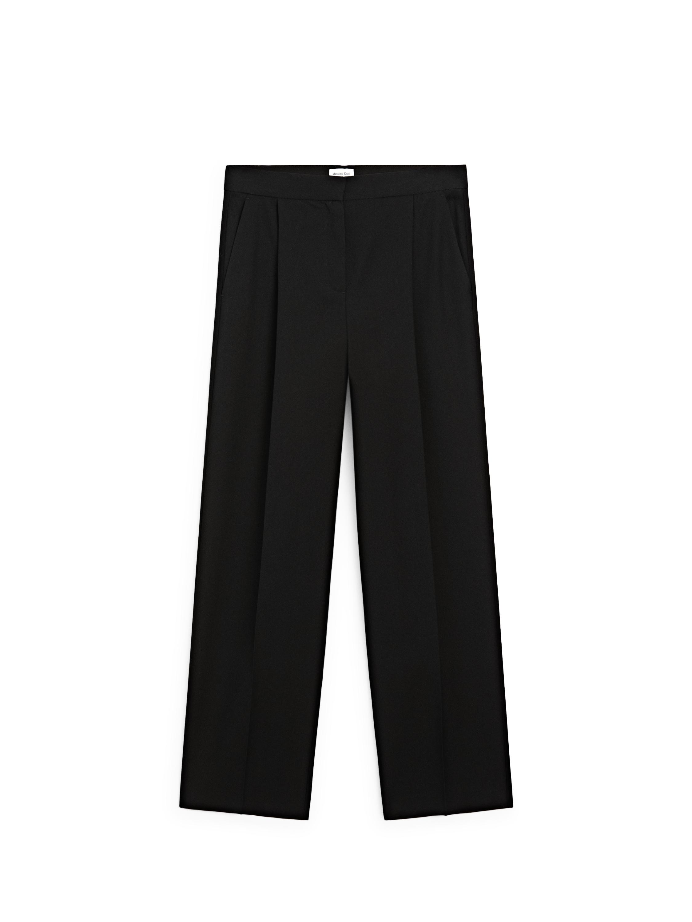 Pantalón ancho. Cierre mediante cremallera y corchete con botón interior . Dos bolsillos laterales. Dos bolsillos de ojal en la parte posterior. Detalle de pinzas en la parte frontal. Confeccionado en tejido 100% lana.