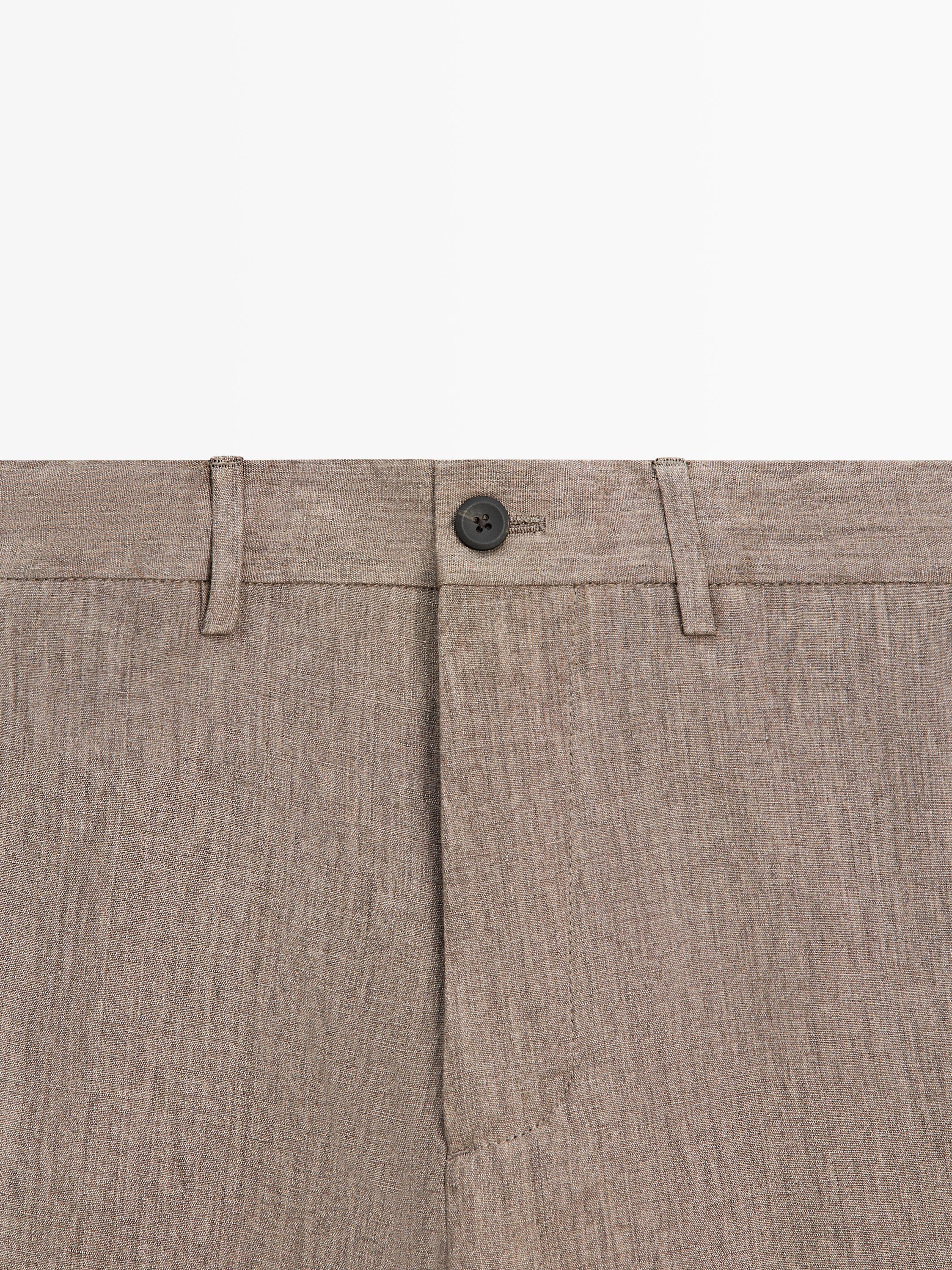 Pantalón de traje confeccionado en tejido principal lino. Cintura con trabillas . Cierre mediante cremallera oculta por tapeta, botón y tira abotonada. Dos bolsillos laterales. Dos bolsillos de ojal en la parte posterior. Esta prenda forma parte de un traje.