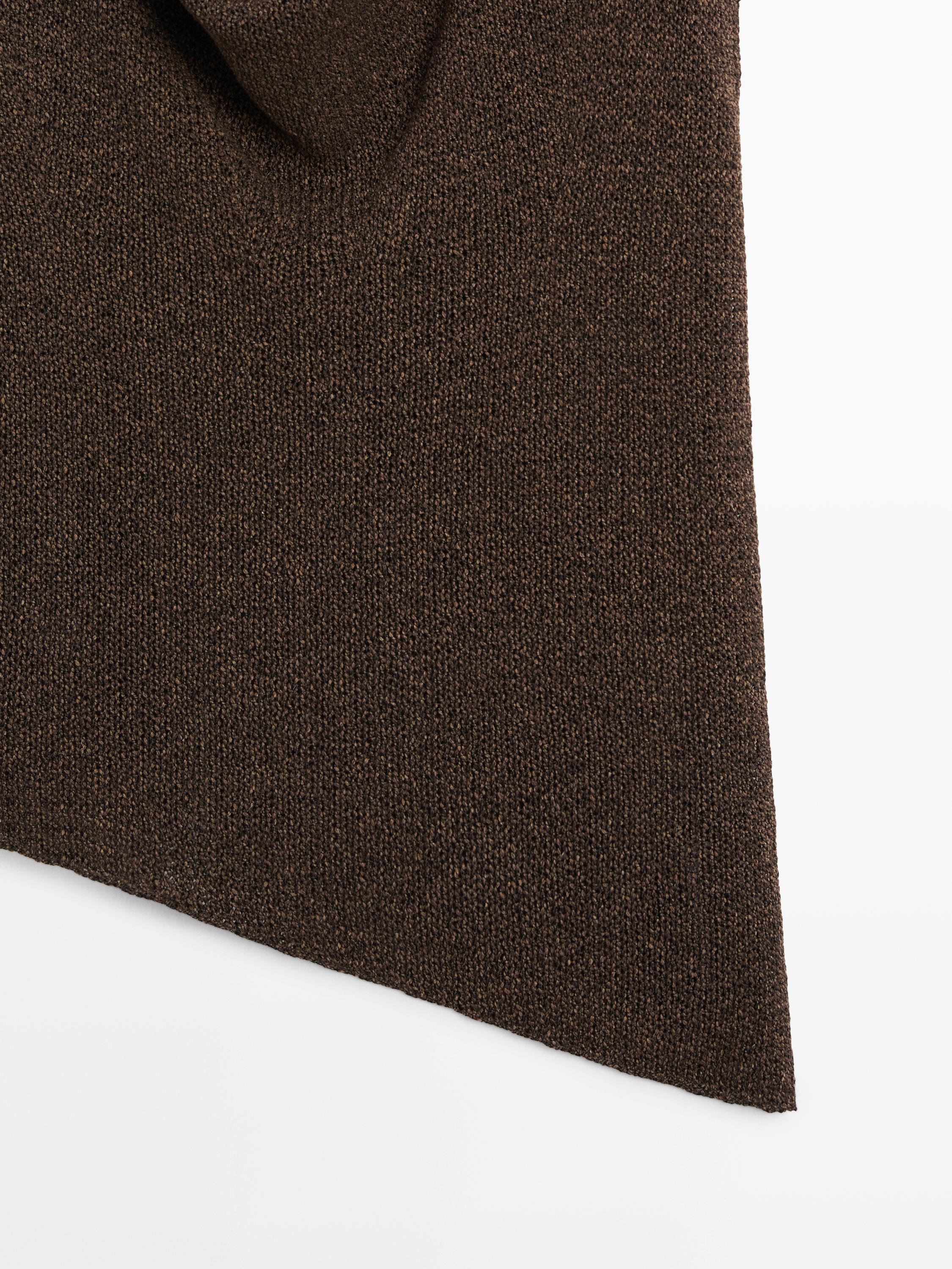 Top asimétrico con detalles drapeados. Cuello pico. Sin mangas.