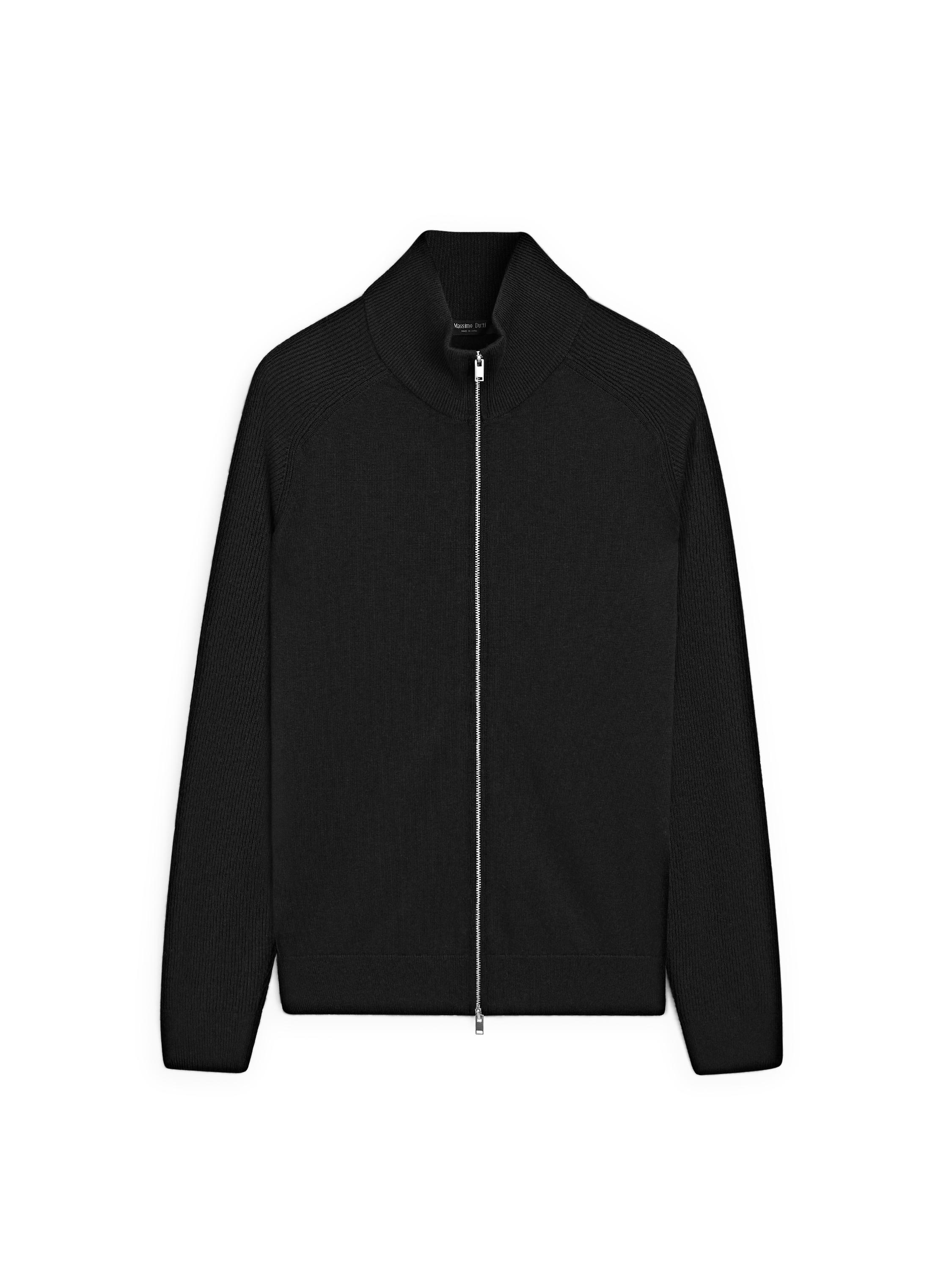 Cotton blend knit cardigan. Raglan sleeve. Long sleeves. It has a two-way zip fastening.