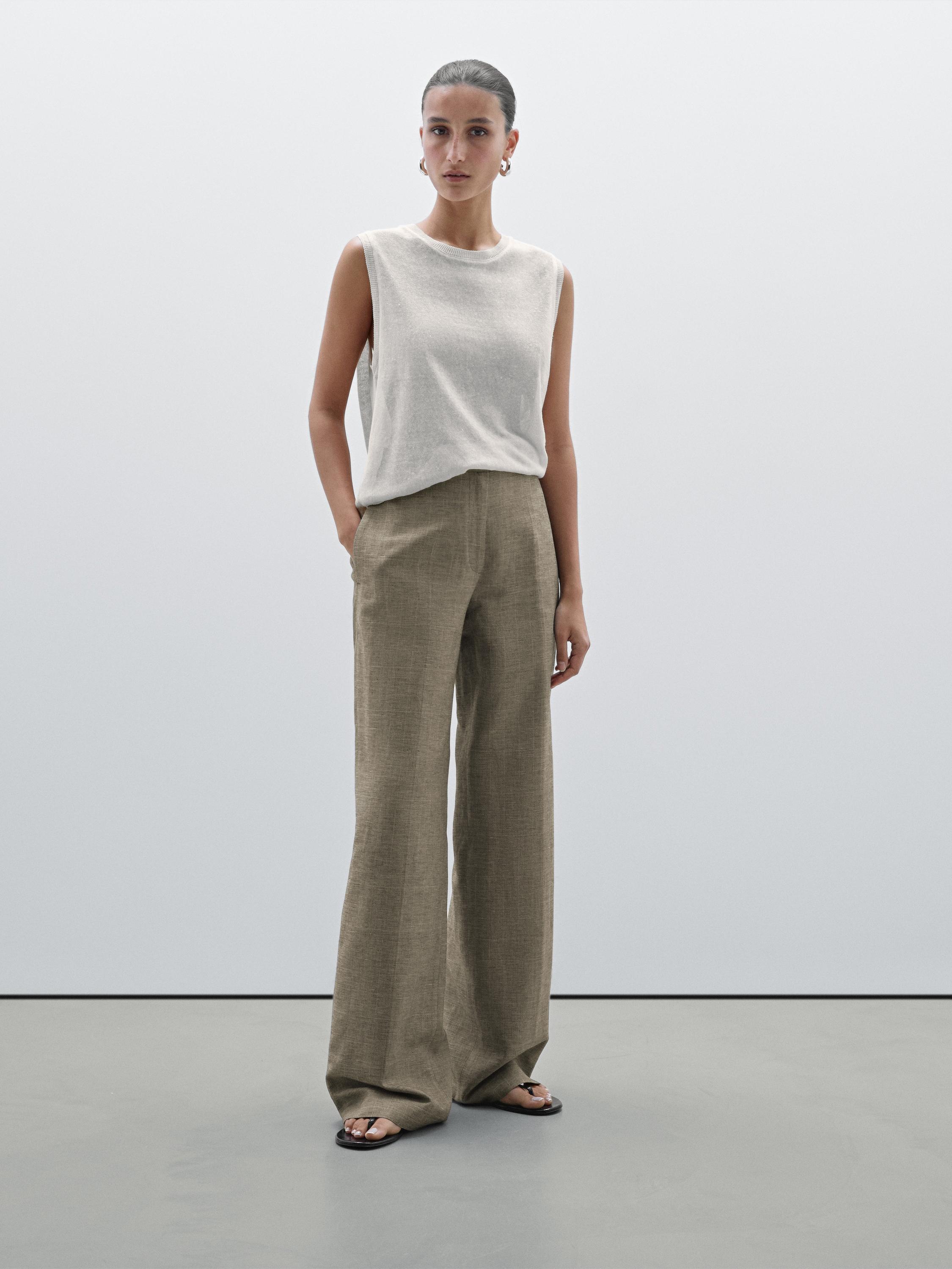 Pantalon de coupe droite. Passants de ceinture . Fermeture Éclair dissimulée par une patte, crochet et bouton. Deux poches sur les côtés. Deux poches passepoilées dans le dos. Pinces sur le devant. Dispose de vêtements pour ensembles.