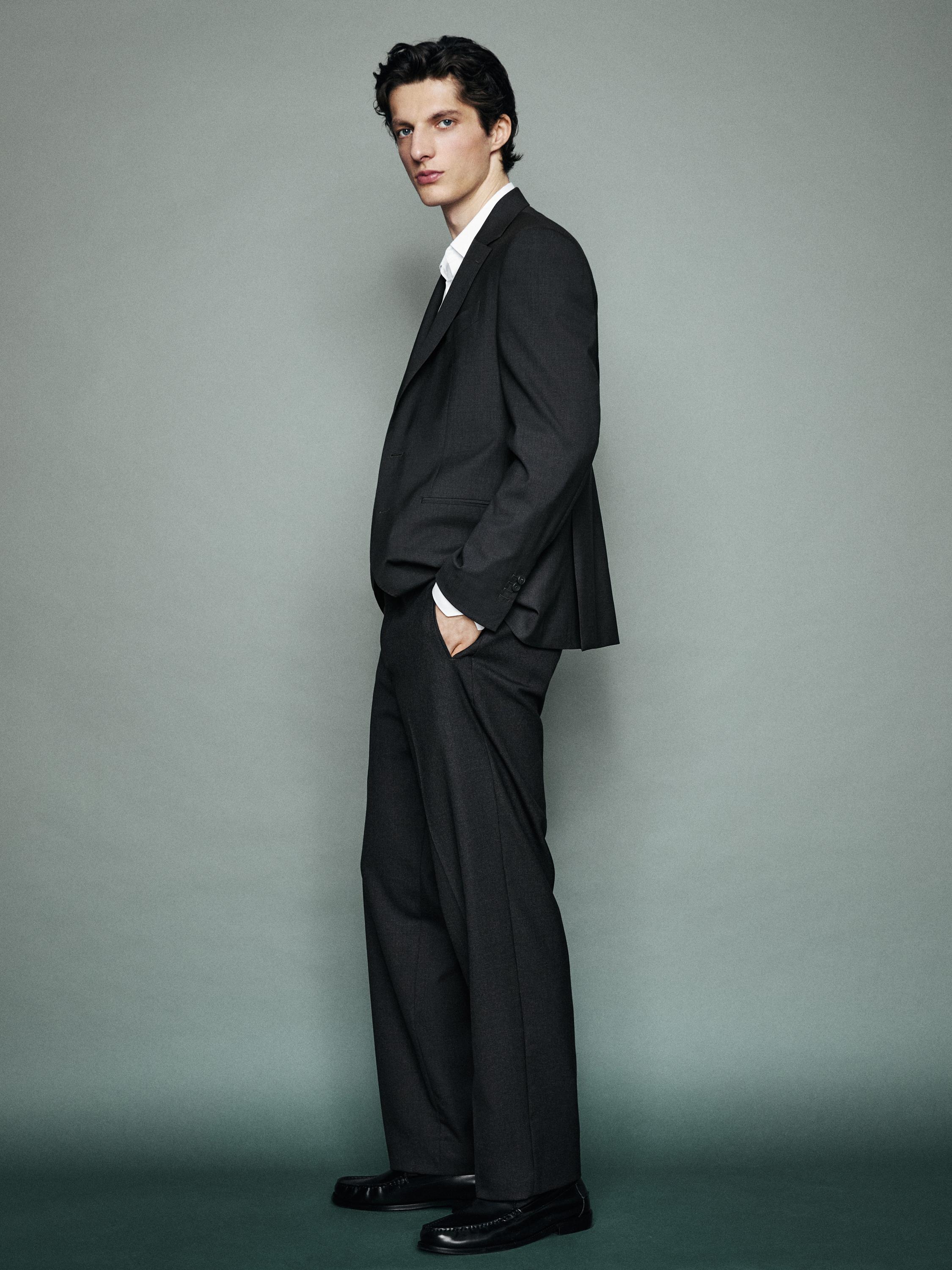 Vue frontale d'un pantalon de costume gris anthracite avec poches latérales et fermeture boutonnée et zippée.