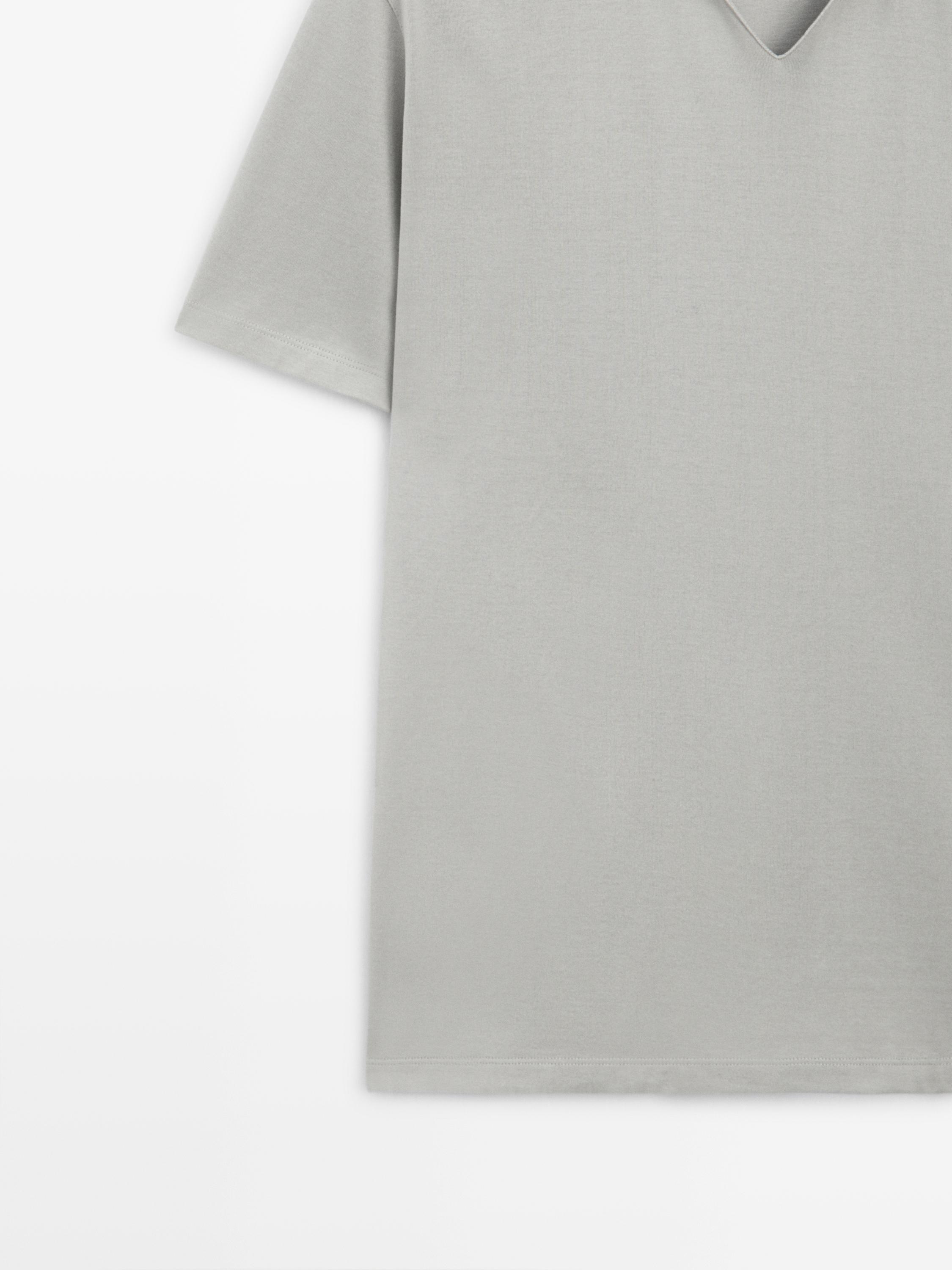 Polo shirt crafted from 100% cotton fabric, featuring a V-neck with lapels and short sleeves.