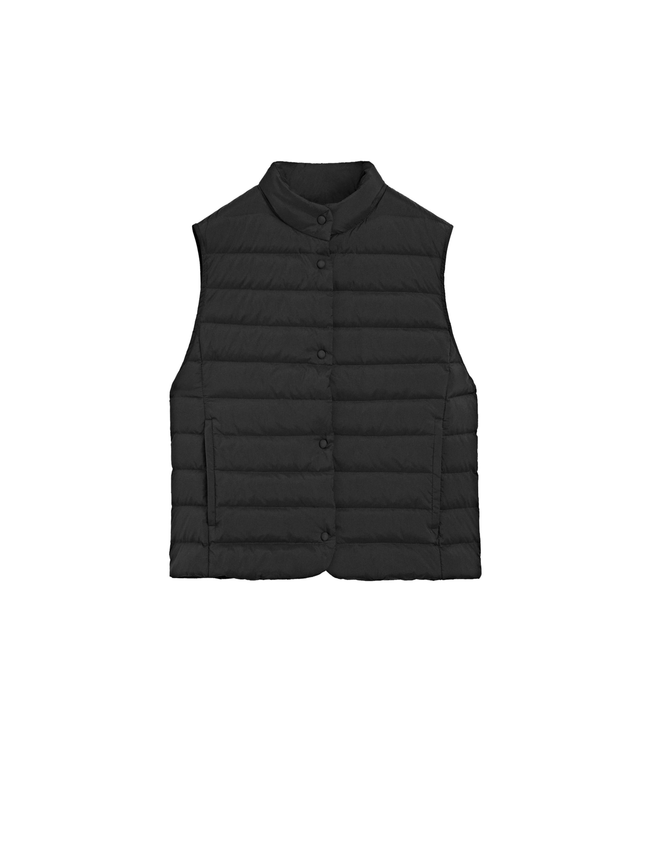 Lightweight quilted waistcoat with feather inner padding. High neck. Fastens with snap buttons. Two side pockets. Lined. Fitted.