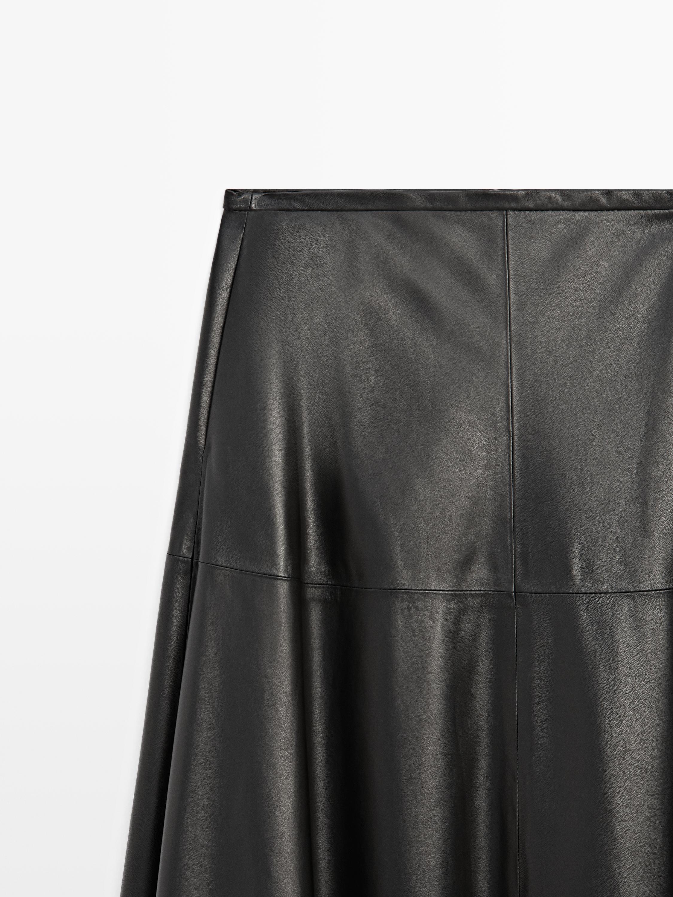 Long flared skirt made of sheepskin with nappa leather finish . Concealed zip and press stud fastening at the back. Lined. Seam details .