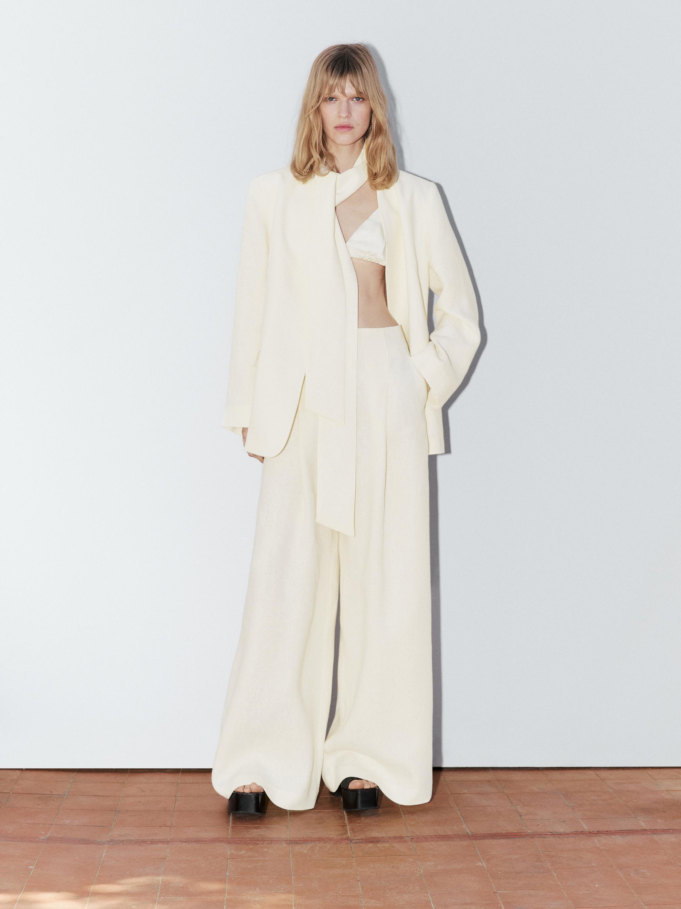 100% linen cropped blazer with scarf detail - STUDIO
