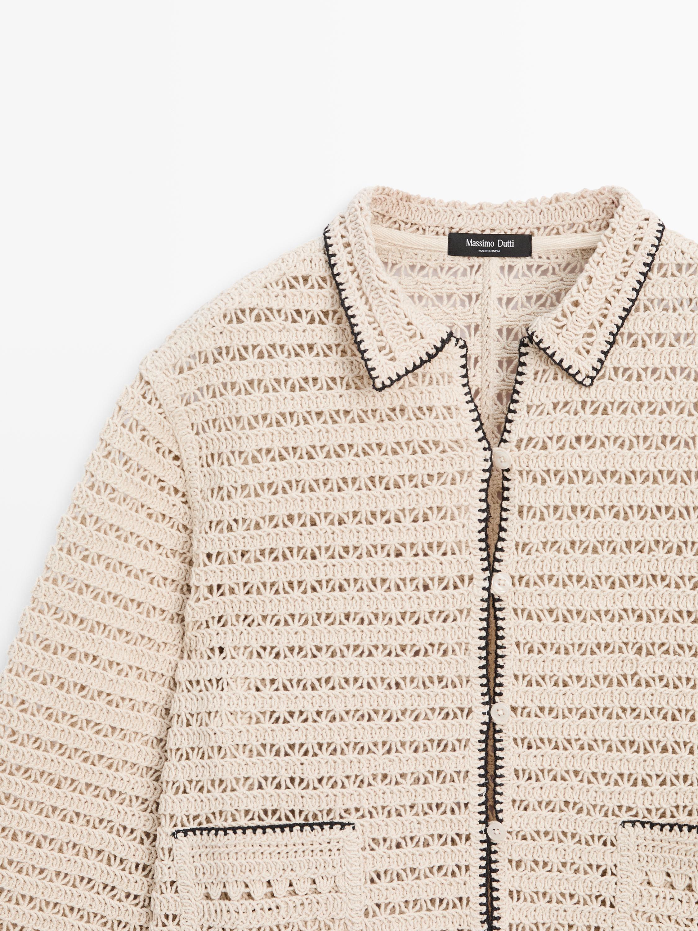 Short jacket made of 100% cotton fabric . Shirt collar. Two patch pockets. Crochet fabric.