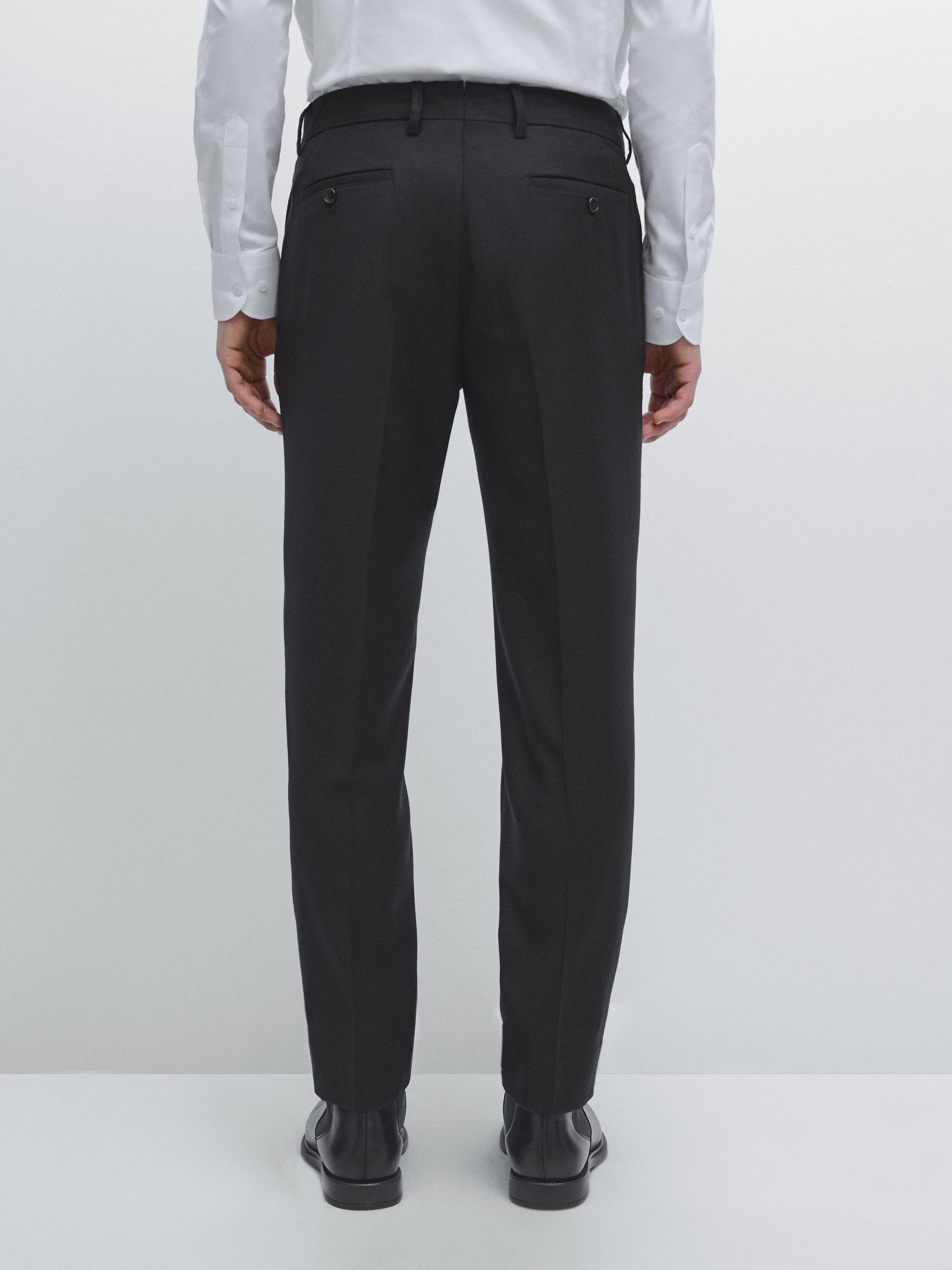 Trousers made of 100% wool fabric. ელვა-შესაკრავი რომელიც დაფარულია მყარად ჩასაჭერი და ღილებიანი თასმით. ორმხრივი ჯიბეები. ორი ღილიანი გაჭრილი ჯიბით ზურგის მხარეს.