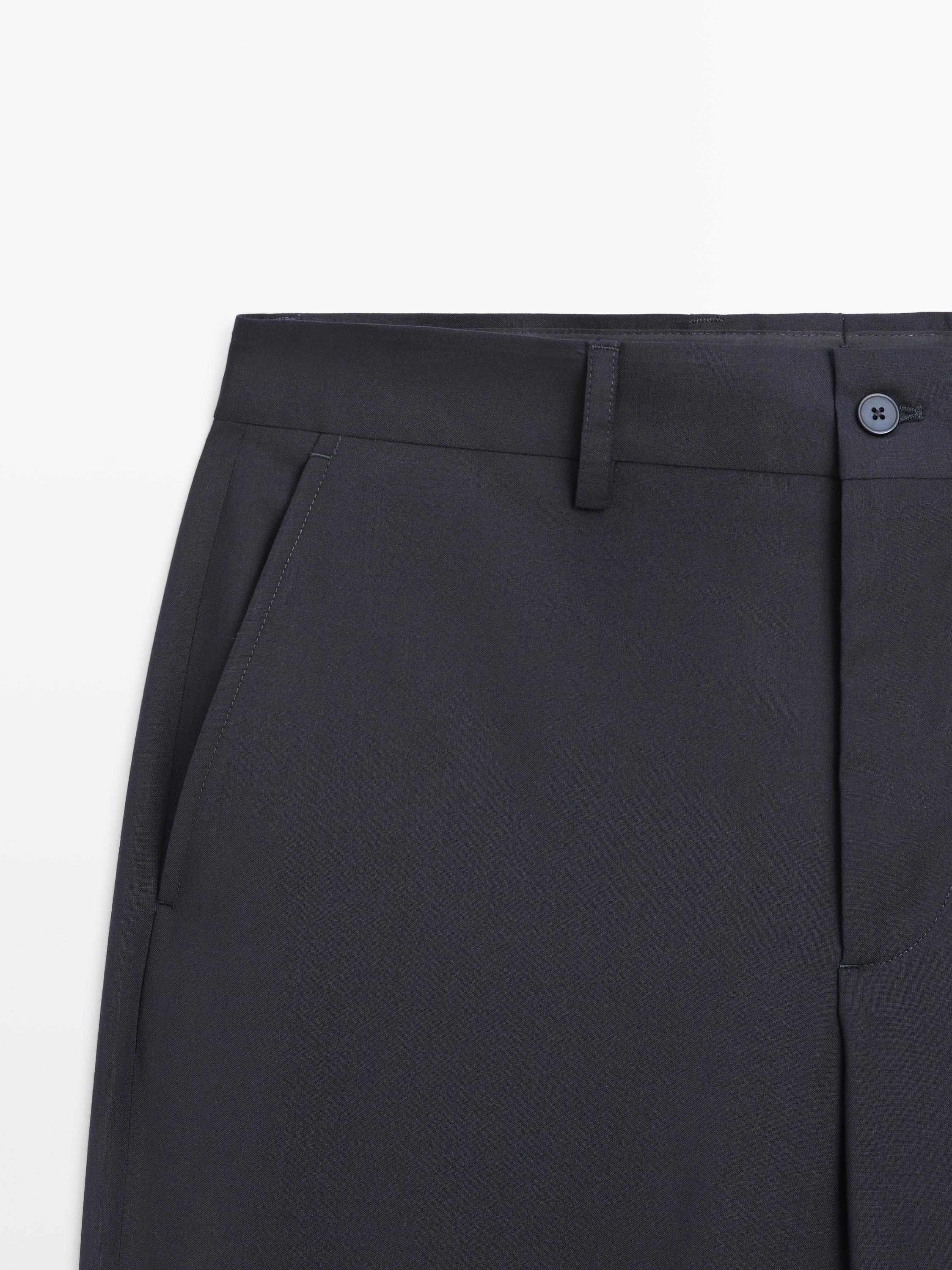 Suit trousers made of 100% wool fabric. Waistband with belt loops. თამასით დაფარული ელვა-შესაკრავი, ღილი და ღილიანი თასმა. ორმხრივი ჯიბეები. ორი ღილიანი გაჭრილი ჯიბით ზურგის მხარეს. This garment is part of a suit.