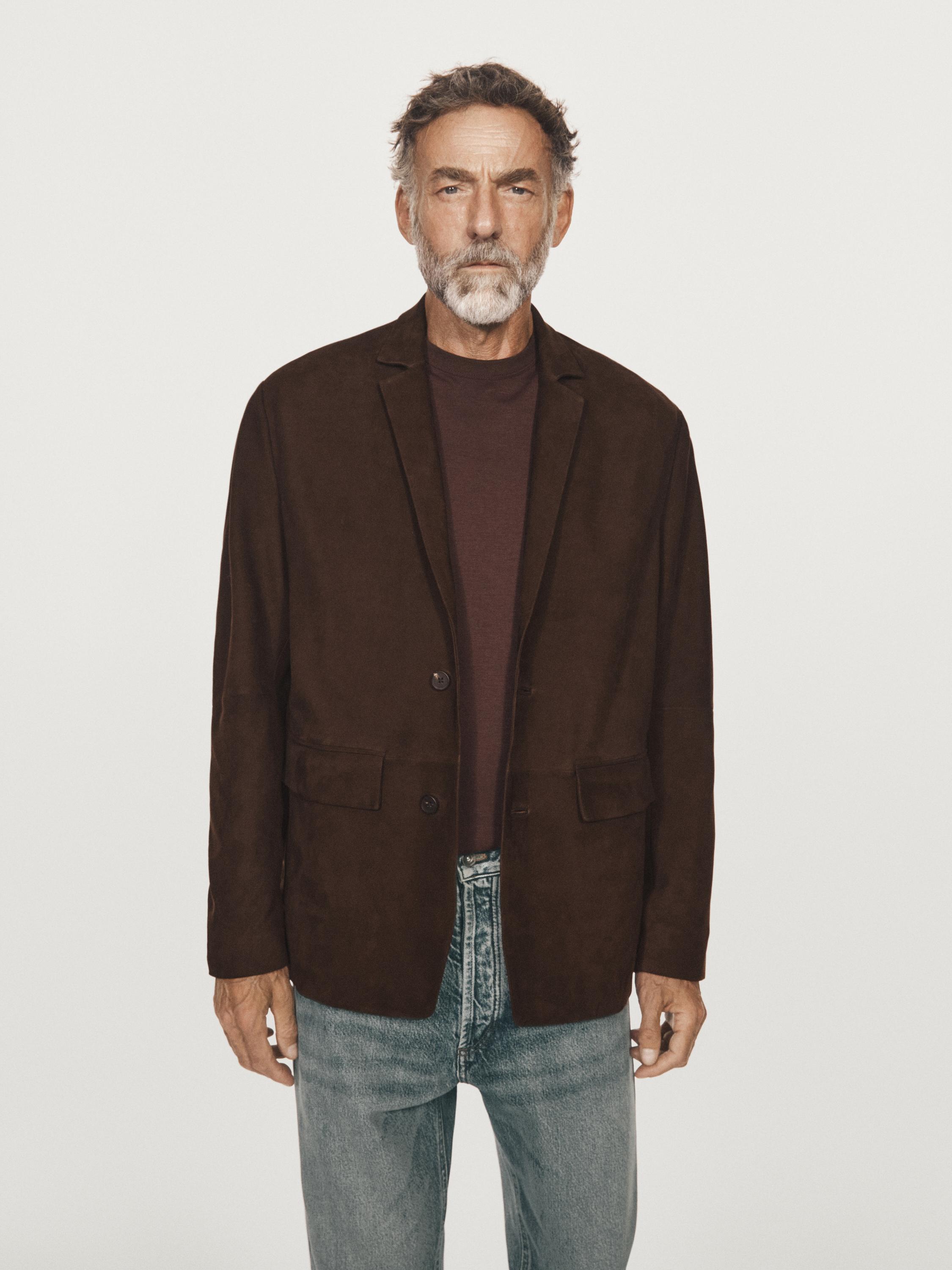 American jacket made from sheepskin with a nubuck finish. გადაკეცილი საყელო. გრძელი მკლავები. ორღილიანი შესაკრავი. Plastron pockets. შიდა ჯიბე. Rear central opening. სარჩულიანი.