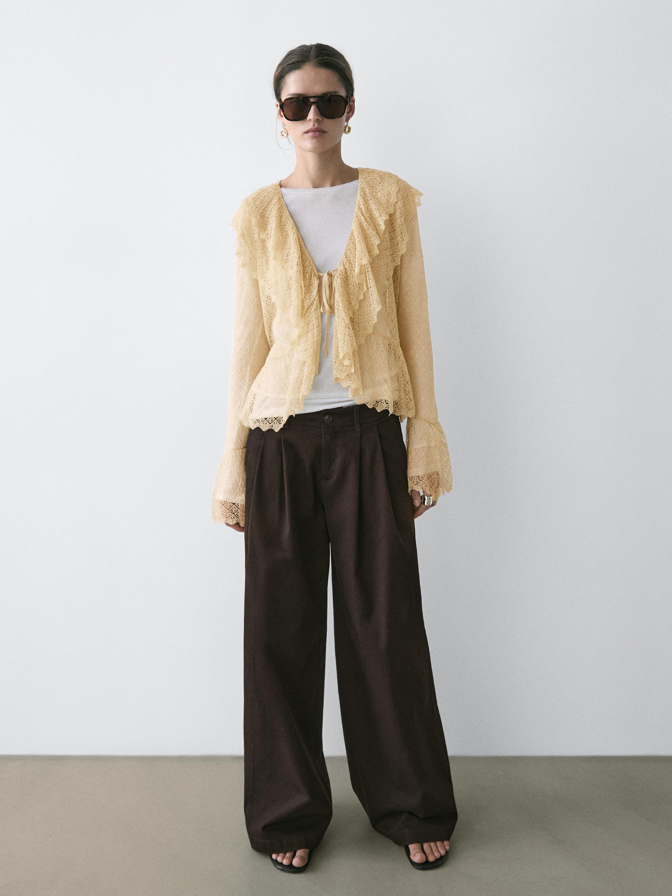 Trousers made of cotton blend fabric. Waistband with belt loops. Front closure with zip and button. ორმხრივი ჯიბეები. მონახაზი დეტალი წინა მხარეს.