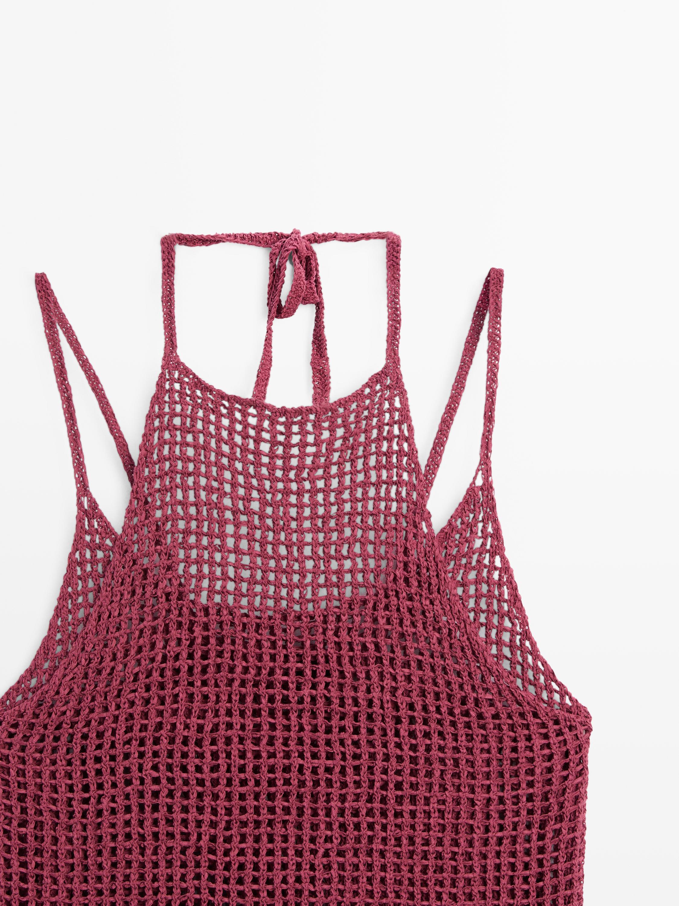 Πλεκτό τοπ από βαμβακερό ύφασμα. Λαιμόκοψη halter με φιόγκο στο πίσω μέρος. Λεπτές τιράντες. Διπλό ύφασμα. Λεπτομέρεια με ανοιχτή ραφή.