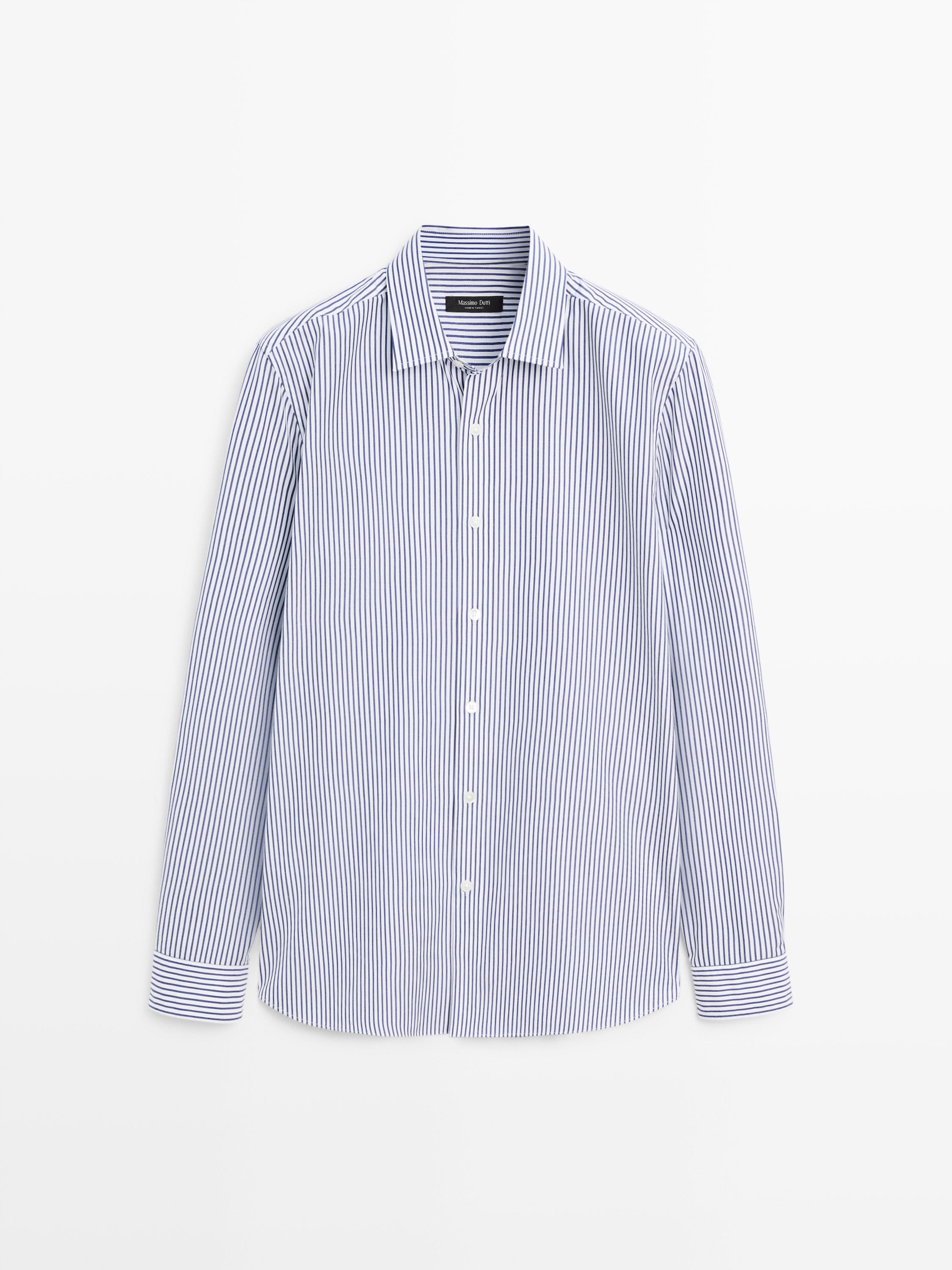 Camisa Regular fit: este fit ofrece comodidad con un poco más de holgura en el torso y los brazos aportando un estilo clásico pero relajado. Manga larga con puño abotonado. Cuello inglés. Cierre mediante botonadura frontal. Detalle de rayas . Confeccionado con tejido 100% algodón.