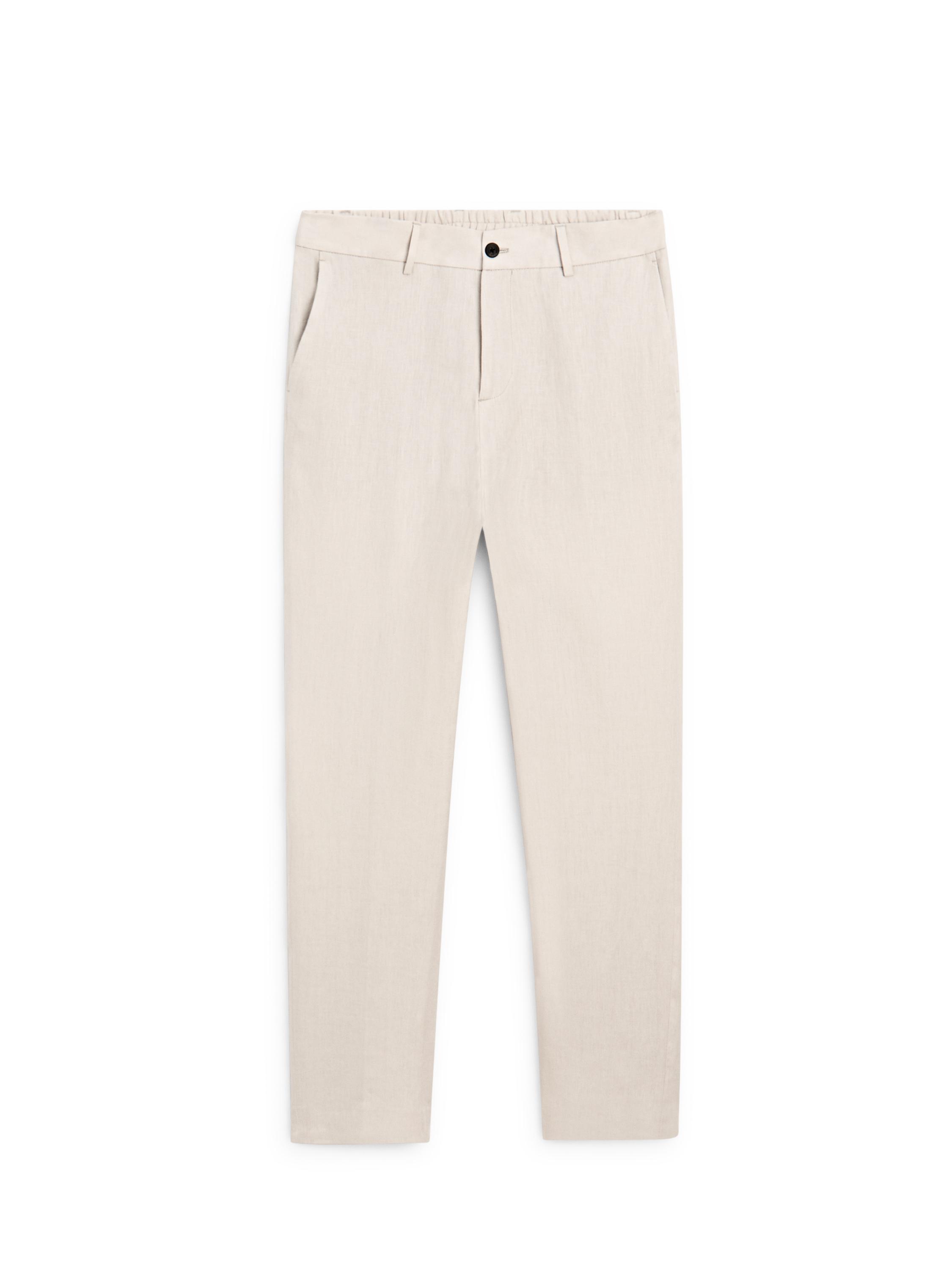 Pantalón confeccionado en tejido 100% lino. Cierre mediante cremallera oculta por tapeta, botón y botón interior. Parte posterior de la cintura con goma elástica. Dos bolsillos laterales. Dos bolsillos de ojal en la parte posterior.