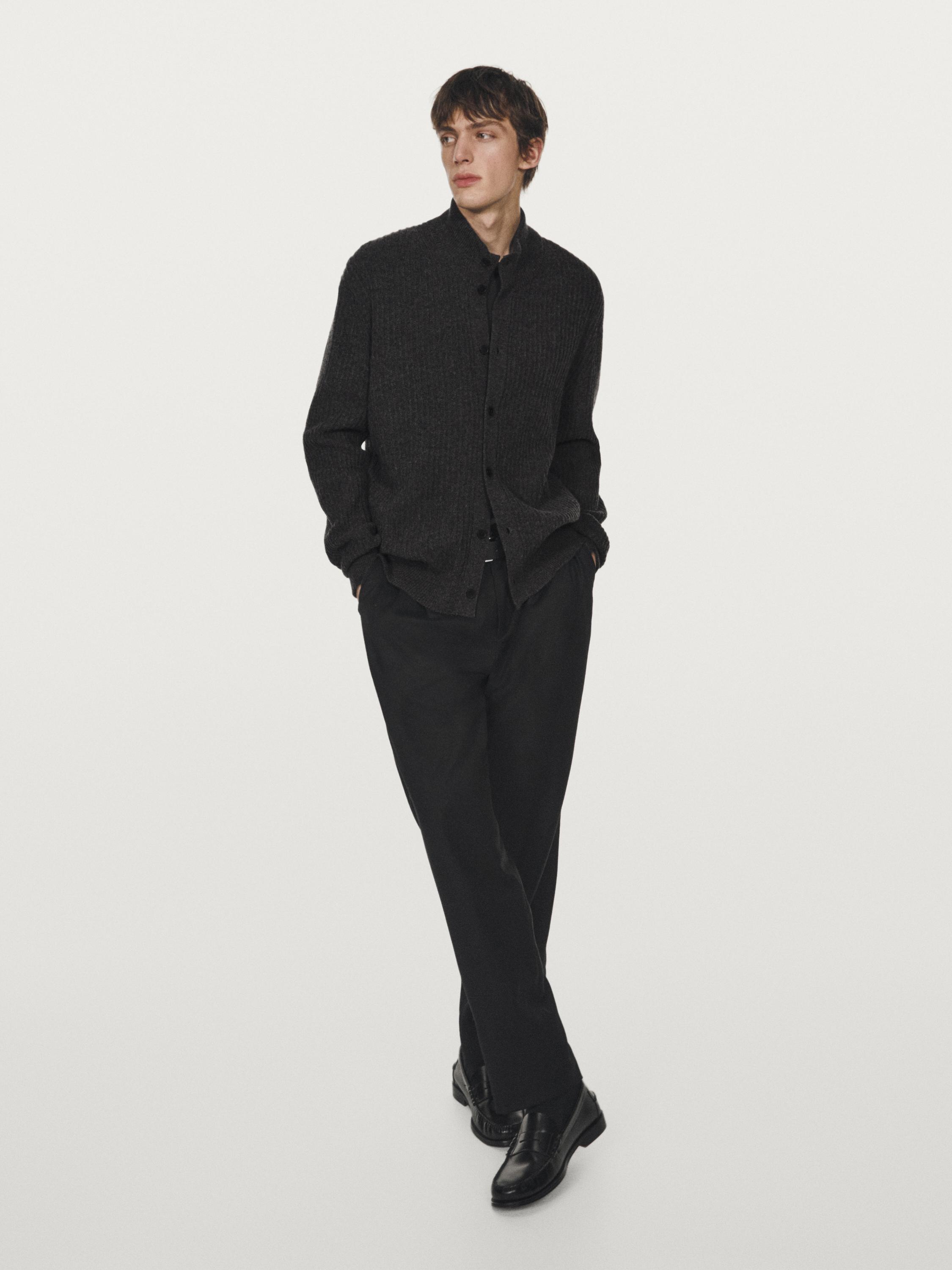 Wool blend knitted cardigan. Button-up front. High collar. Ribbed trims .
