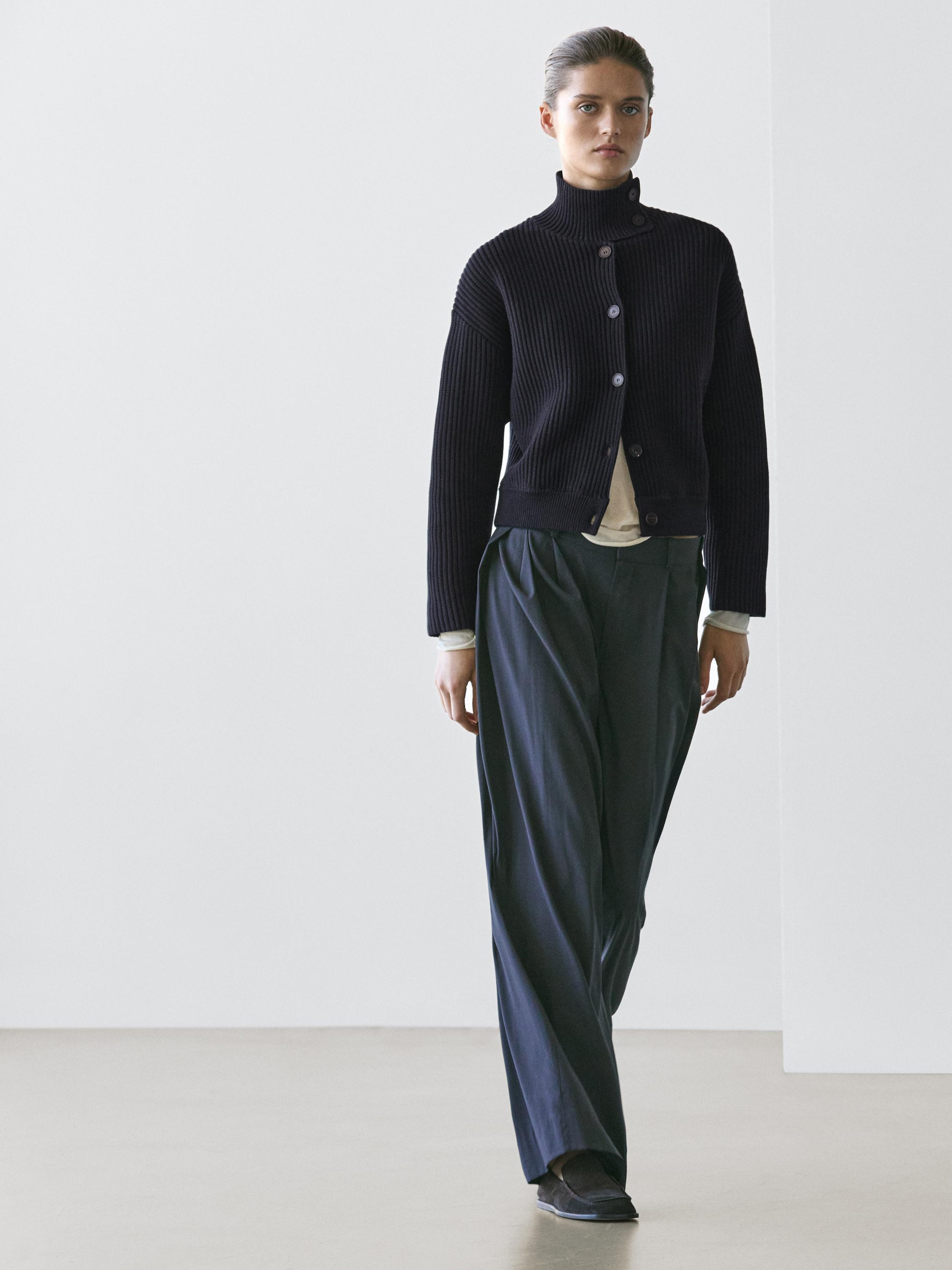 Cardigan made of knitted fabric with cotton. Buttoned high collar. Long sleeves. Button-up front. Ribbed trims .