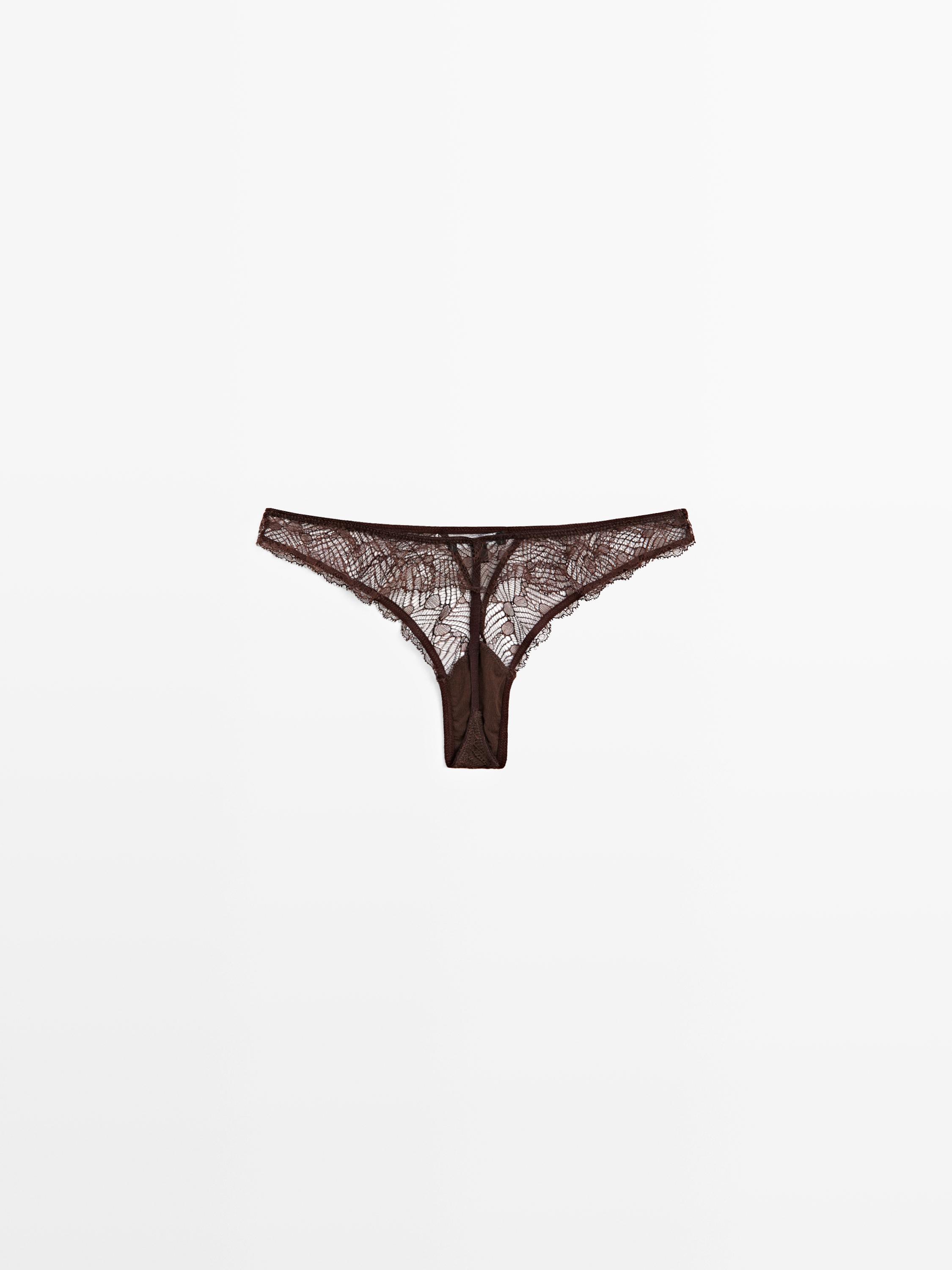 Thong made of lace fabric with mesh triangle detail . Mid-rise and elasticated waist . Semi-sheer fabric. Wavy lace finish . Matching garment available.