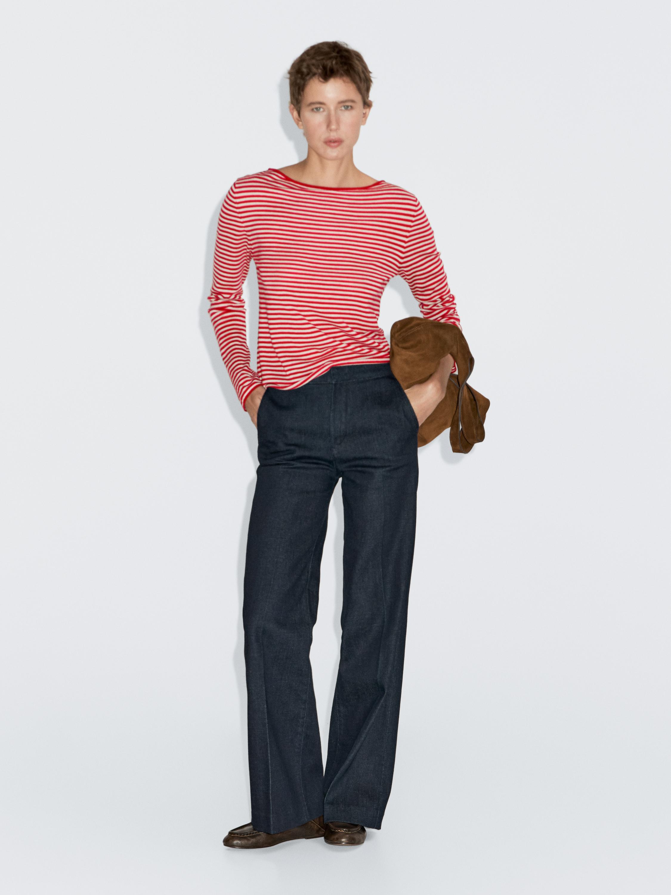 Wool blend knit sweater. Boat neck. Round neck. Long sleeves. Striped detail. Soft fabric that’s pleasant to the touch .