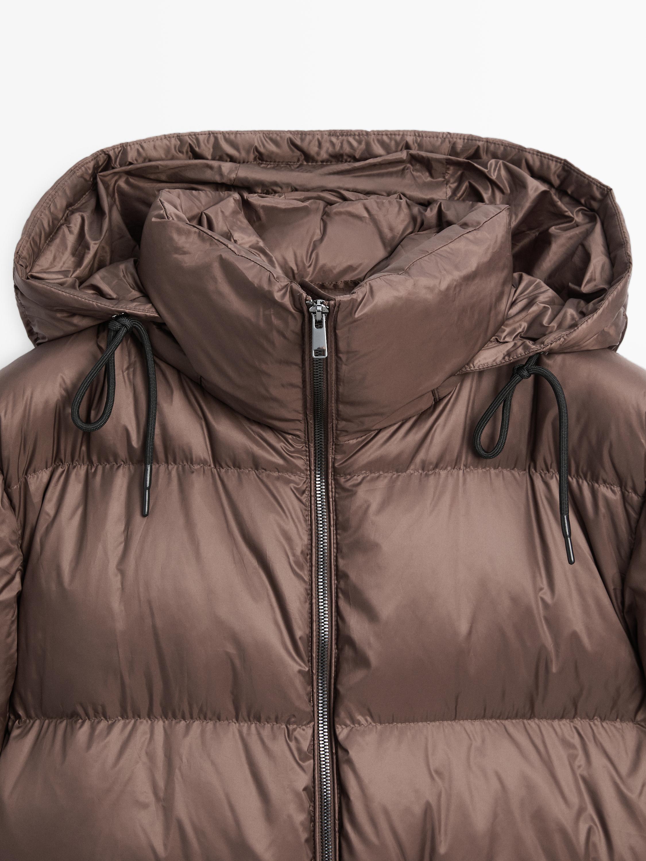 Puffer jacket with down and feathers blend inner padding. Long sleeves with snap cuffs. It has a two-way zip fastening. Adjustable and detachable hood. High collar. Two side pockets with snap button flaps. Water-repellent fabric.