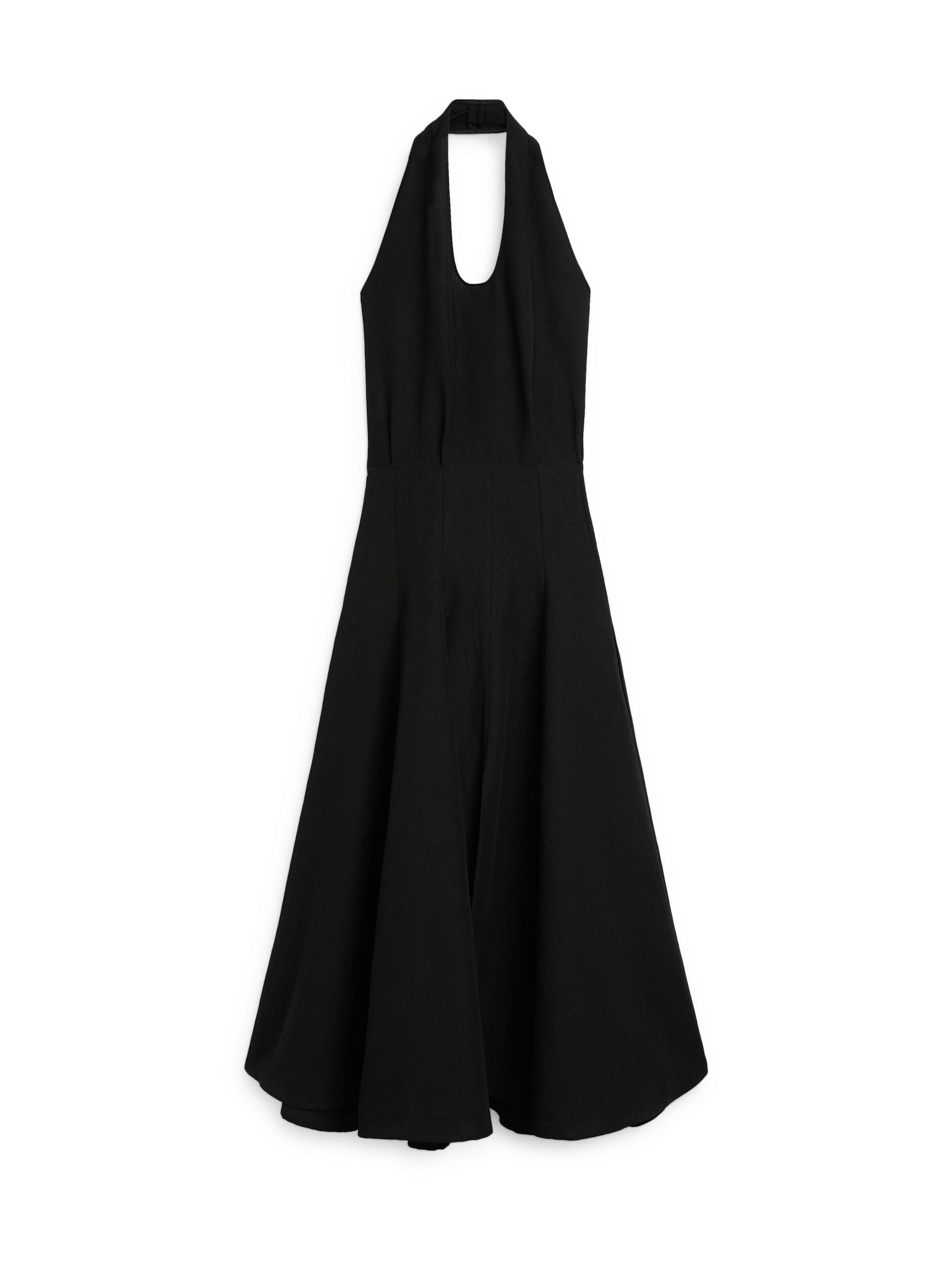 長版喇叭洋裝. 掛脖領. 正面開衩. 側身拉鍊開合. 露背設計.
