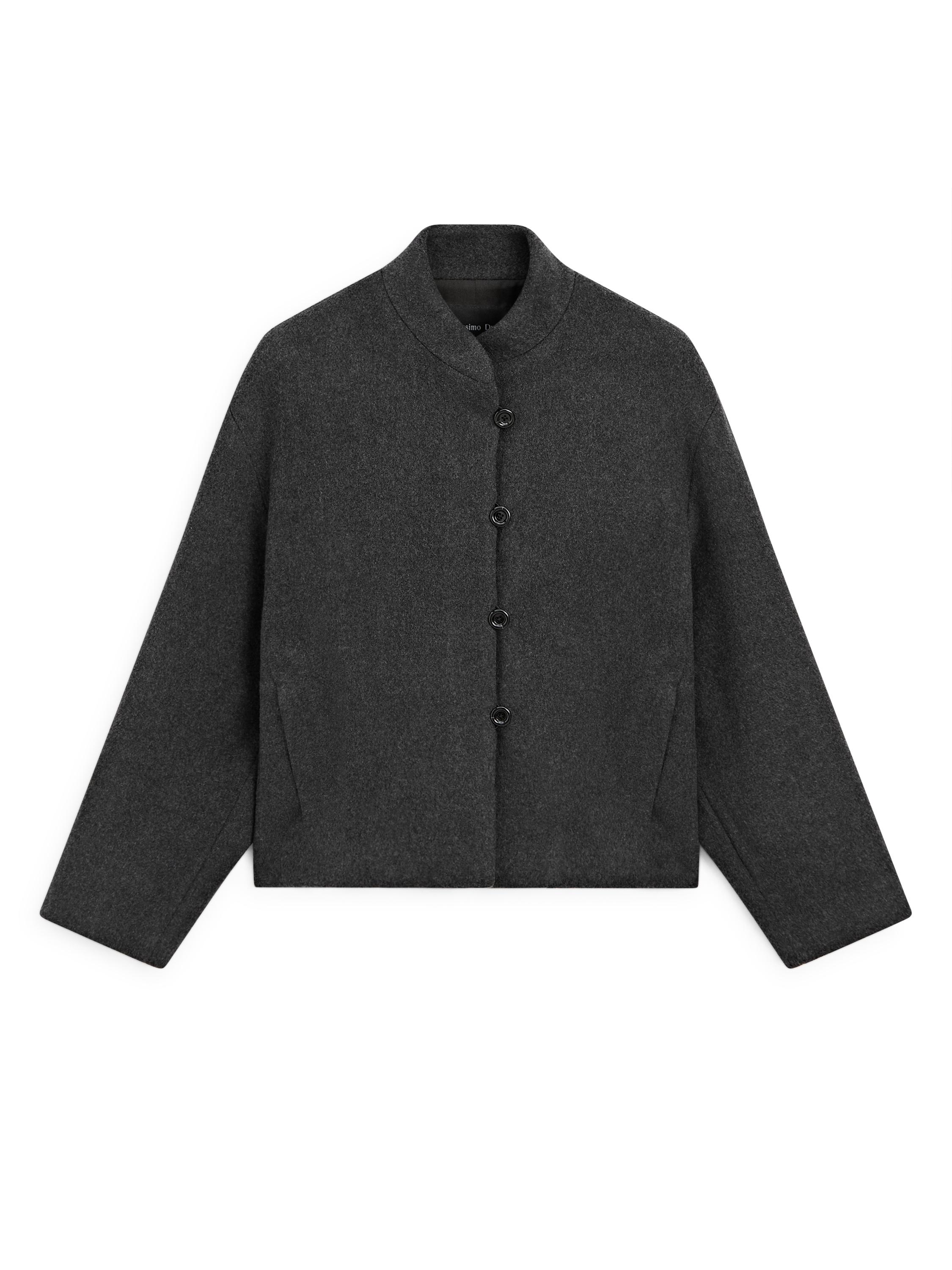 羊毛混紡外套. 立領. 長袖. 正面單排紐扣開合. 兩個側口袋. 內襯. 插色效果飾面.