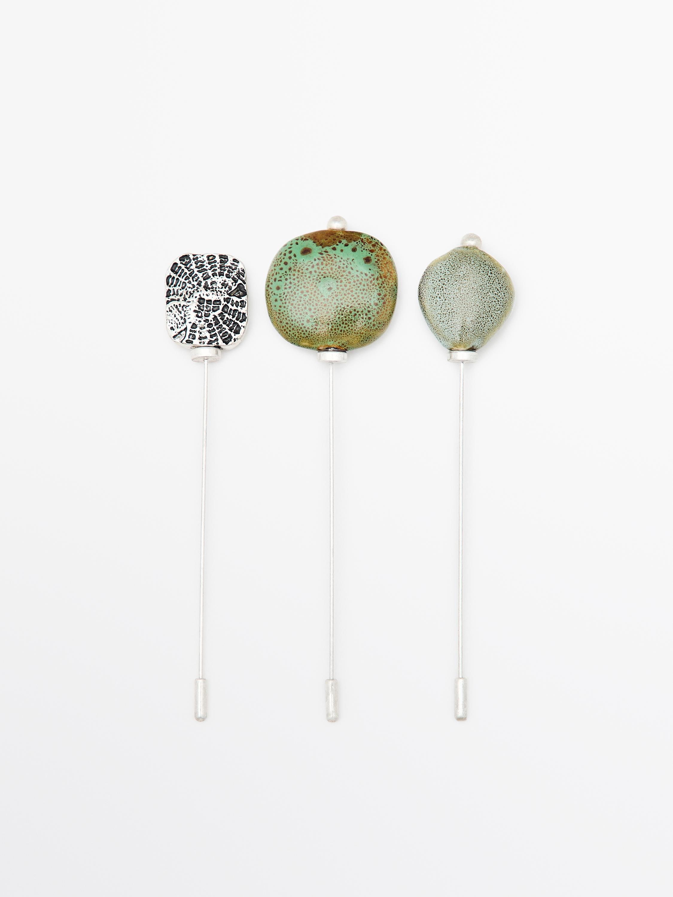 Broche tipo alfiler, pieza de cerámica y pieza metálica .