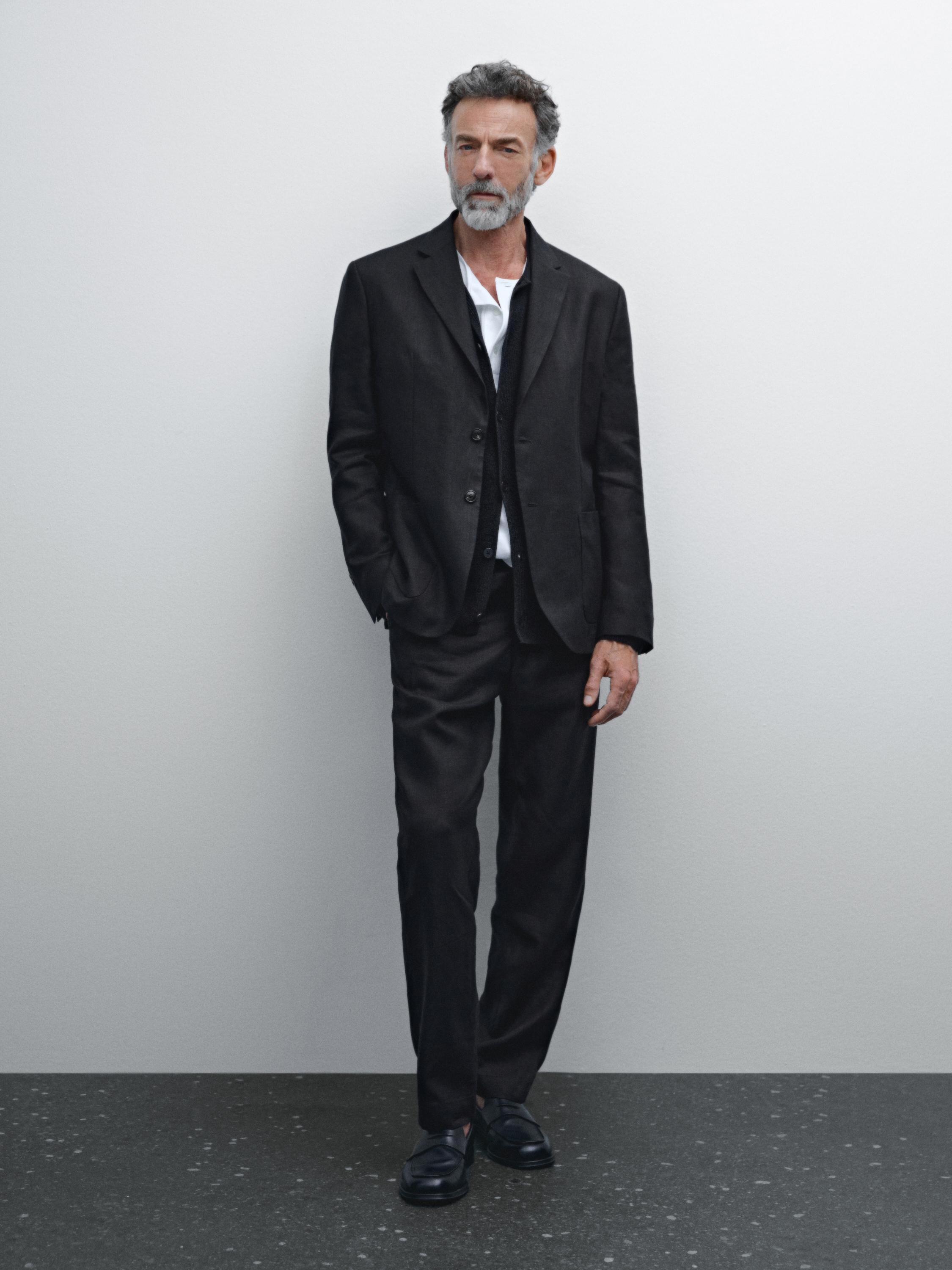 Blejzer izrađen od 100 % lana. Ovratnik s prorezanim reverima. Kopčanje s dva gumba. Dva našivena džepa. Ovaj odjevni predmet dio je odijela.