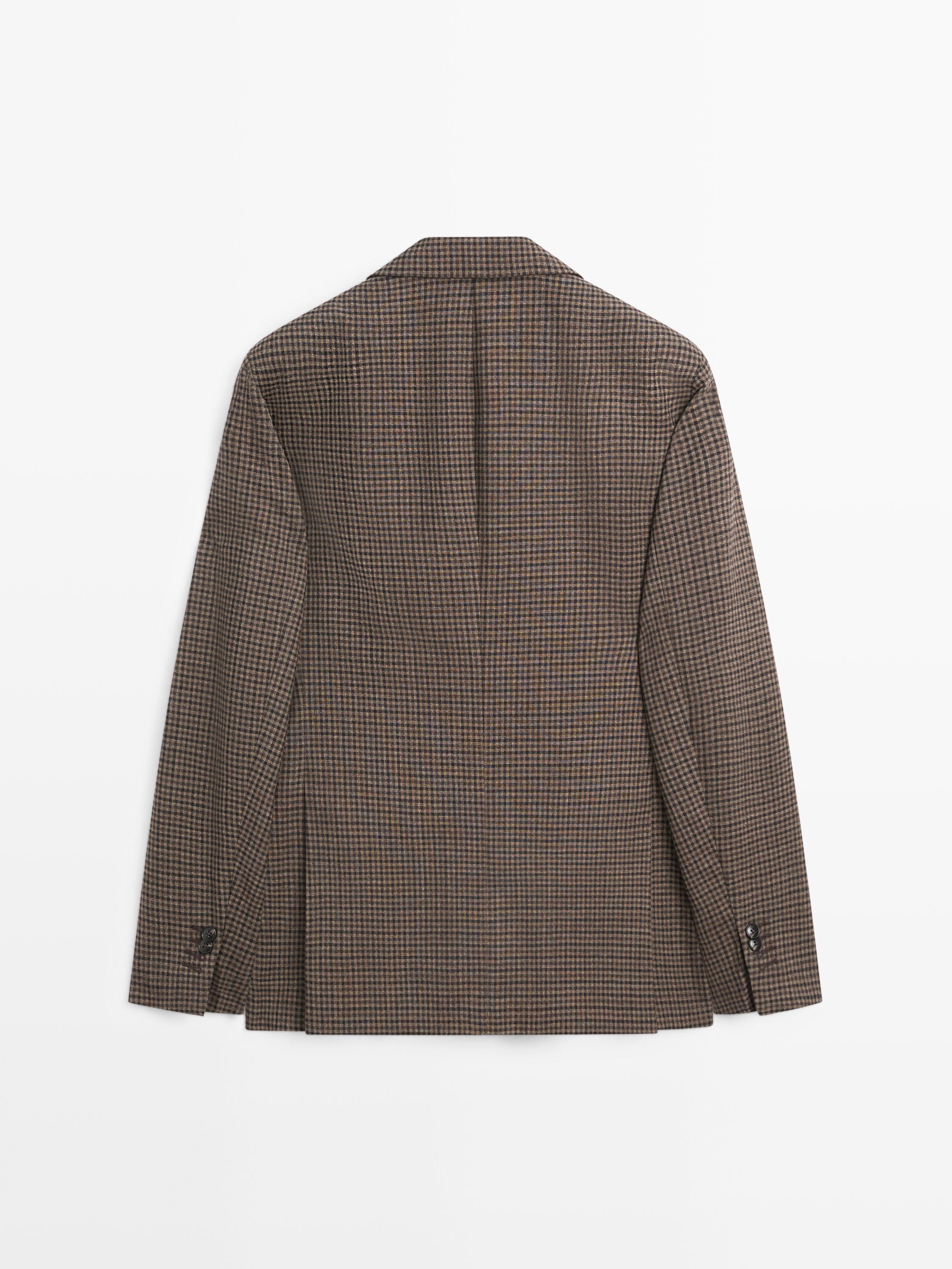 Blazer yang terbuat dari wol 100%. Kerah lapel. Lengan panjang dengan manset berkancing. Detail kotak-kotak mikro. Pengancing dua kancing. Dua saku depan .