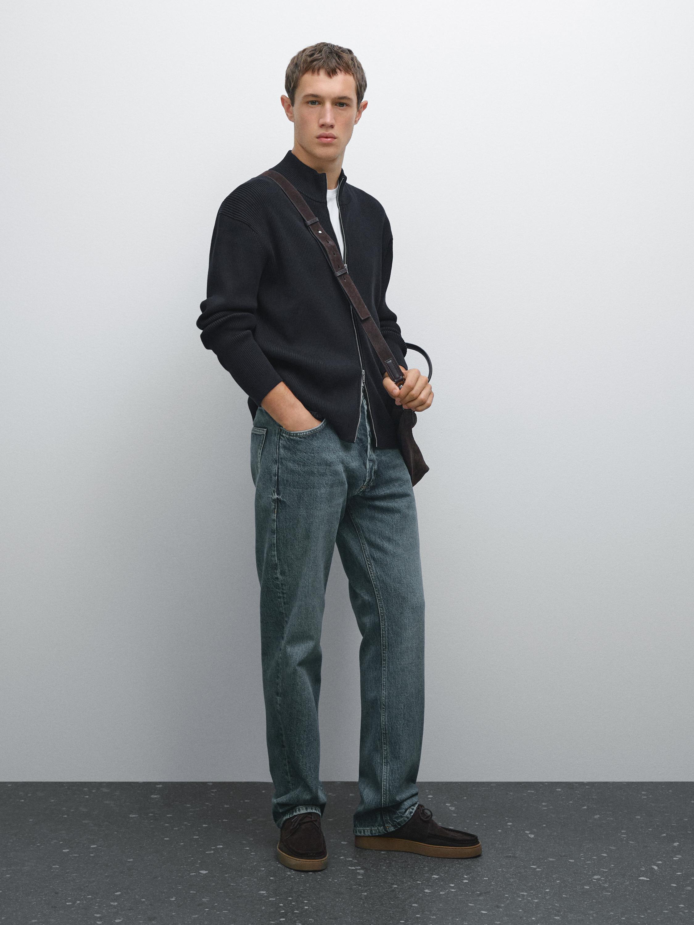 Cardigan made of knitted fabric with 100% cotton. Lengan panjang. Ritsleting. Kerah tinggi. Tepian ribbed .