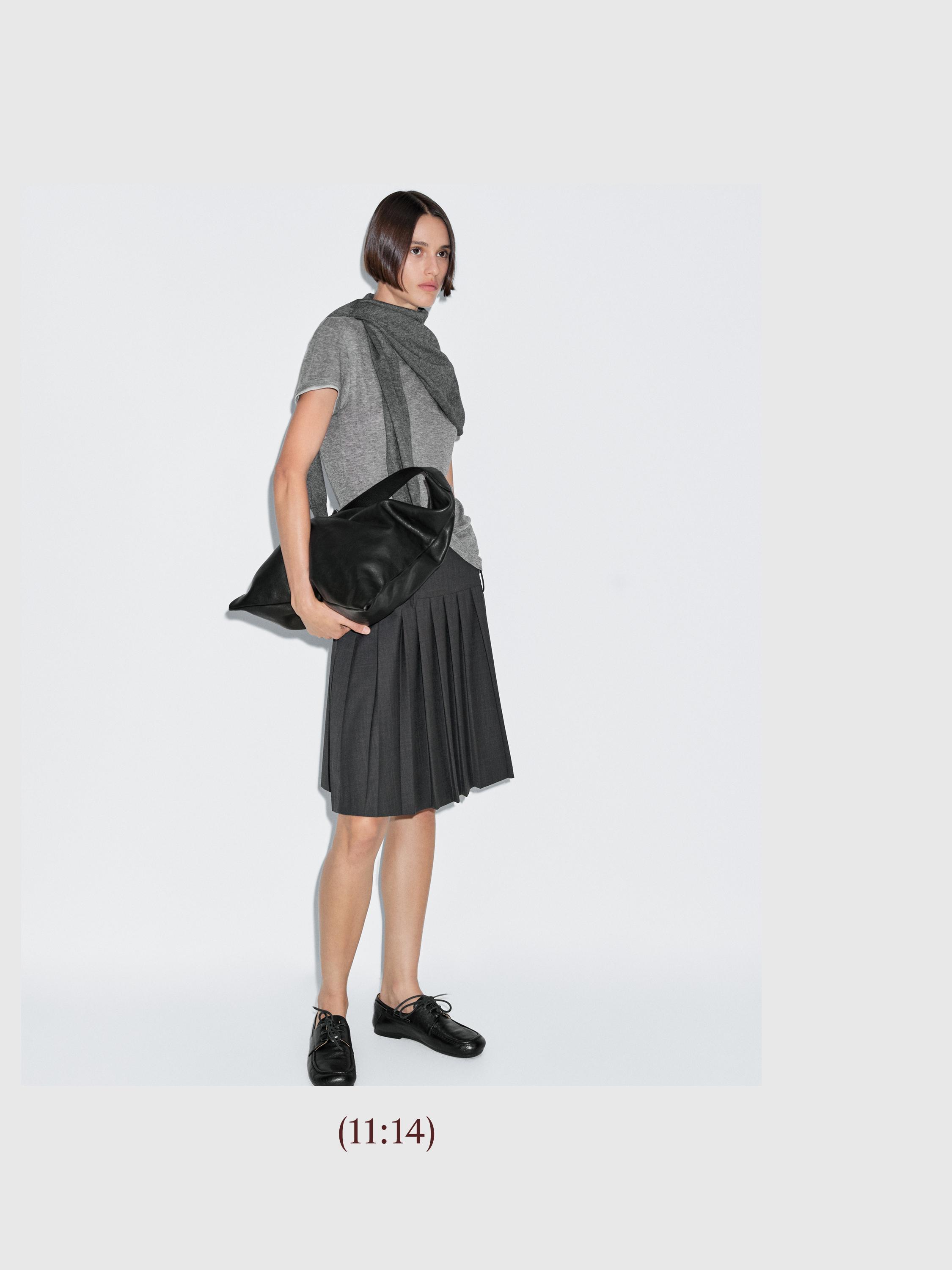 Rok pendek dengan detail lipit kotak. Detail loop sabuk . Detail sabuk korset pas pinggang. Ritsleting samping.