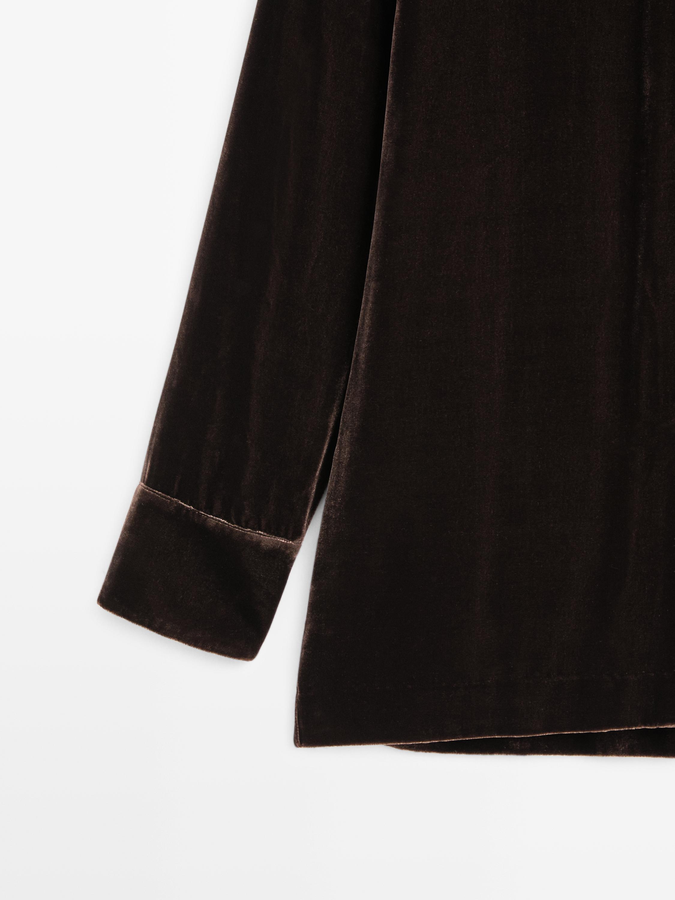 Long sleeve shirt. Shirt collar. Velvet fabric. Button-up front. Matching garment available.